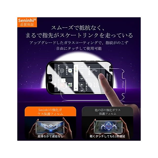 【Seninhi】らくらくスマートフォン me F-01L f-42a 強化ガラス 保護フィルム について 仕様 厚さ: 0.26mm 光透過率: 99% 素材:日本AGC旭硝子ガラス 対応機種:らくらくスマートフォン me F-01L f-42a【同梱品】 2 × 強化ガラスフィルム 1 × 取扱説明書 4 × スクリーンクリーニングキット 2 × ホコリ除去用ステッカー 特徴 【9h高硬度】 私たちの強化フィルムは日本AGC旭硝子ガラスを使用し、4.5時間の高温急冷と多重強化処理して、同じ厚さの通常のガラスフィルムに比べて約5倍の強さを持ち、ガラスフィルムは9Hの最も硬い表面硬度に達しました。ナイフなどの鋭いものでも傷を与えません。日常生活で気軽に対応できます。 【飛散防止】 飛散防止を通して、万が一ガラスが割れても破片が飛散しなく、破片による重傷事故を減らして、とても安全です。 【高感度タッチ】 この強化フィルムは0.26mmのゴールデン厚さを設計しており、防爆する同時に、感度が高いタッチ体験と連続タッチを確保し、高感度でスムーズなオンスクリーン操作を実現し、ガラスフィルムを取り付けない画面とほぼ同じような使用体験を与えます。高感度でスムーズなオンスクリーン操作は様々なゲーム アプリケーションに適用します。 【99%以上の携帯電話ケースに干渉しない】 百件以上な携帯電話ケースをテストしましたが、適応率は 99%に達しました。高品質の接着剤を使用したので、携帯電話ケースに取り付けられている瞬間保護フィルムがわずかに浮き、軽く押すと気泡がきれいに消えます。 【素人でも簡単に貼り付け】 ガラスフィルムの取扱説明書に張り付ける方法は詳しく記載したので、位置をよく合わせた後、上から軽く貼り付けると、シリコン吸着層が自動的に吸着し、気泡が発生しません。誰でも簡単に貼り付けられ、万が一失敗しても剥がして貼り直すことができます。 三、ご注意事項: 1.フィルムを貼り付ける前に、手をきれいに洗ってください。 2.泡があれば、クロスを指に巻きつけて少しずつ絞りだしてください。 3.貼り直しによる泡を防止するため、はがす際にフィルムの粘着面に手や物が触れないようご注意ください。 4. 保護フィルムは過度の衝撃等を防止するものではありません。携帯電話の故障、紛失等の責任は負いかねます。 四、アフターサービス ご購入日より180日以内に初期不良や、ヒビ・欠け・ホコリ混入・サイズ違い等の使用上の問題がございましたら、ご遠慮なく、いつでもお気軽にご連絡ください。私たちは具体的な問題により、お客様に満足できる解決策を提供します。 【ご注意】商品はガラス製のため、貼り付け後の落下による破損は外となります。