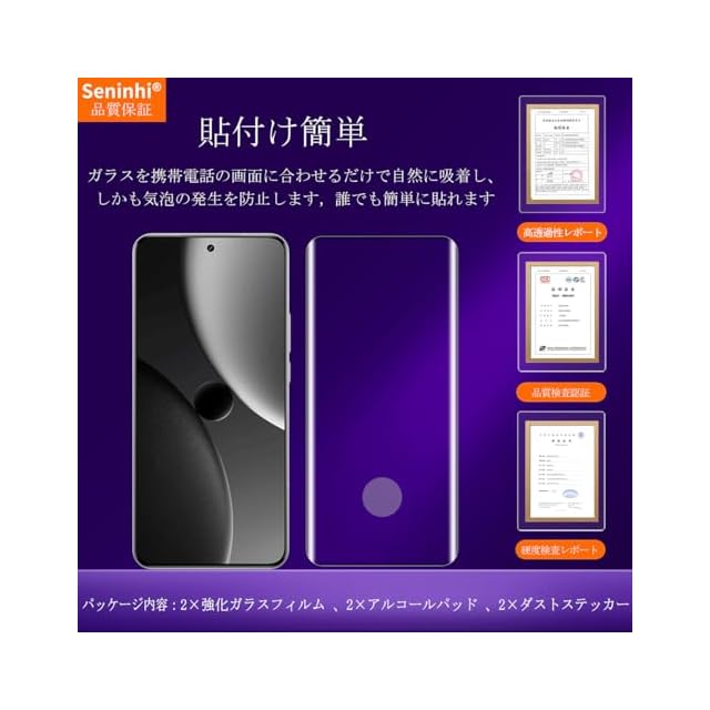 <b>【Seninhi】 Xiaomi 15 Ultra 強化ガラス 保護フィルム について</b> <br> <br><b>仕様 </b><br>厚さ: 0.26mm <br>光透過率: 99% <br>素材:日本AGC旭硝子ガラス <br>対応機種:Xiaomi 15 Ultra <br><br><b>【同梱品】</b> <br>2 × 強化ガラスフィルム <br>2 × レンズ保護フィルム <br>2 × アルコールペーパータオル <br>2 × ホコリ除去用ステッカー <br> <br><b>特徴</b> <br><b>【9h高硬度】</b> <br>私たちの強化フィルムは日本AGC旭硝子ガラスを使用し、4.5時間の高温急冷と多<br>重強化処理して、同じ厚さの通常のガラスフィルムに比べて約5倍の強さを持ち、<br>ガラスフィルムは9Hの最も硬い表面硬度に達しました。ナイフなどの鋭いものでも<br>傷を与えません。日常生活で気軽に対応できます。 <br> <br><b>【飛散防止】</b> <br>飛散防止を通して、万が一ガラスが割れても破片が飛散しなく、破片による重傷事<br>故を減らして、とても安全です。 <br> <br><b>【高感度タッチ】</b> <br>この強化フィルムは0.26mmのゴールデン厚さを設計しており、防爆する同時に、<br>感度が高いタッチ体験と連続タッチを確保し、高感度でスムーズなオンスクリーン<br>操作を実現し、ガラスフィルムを取り付けない画面とほぼ同じような使用体験を与えます。<br>高感度でスムーズなオンスクリーン操作は様々なゲーム アプリケーションに適<br>用します。 <br> <br><b>【99%以上の携帯電話ケースに干渉しない】</b> <br>百件以上な携帯電話ケースをテストしましたが、適応率は 99%に達しました。高品質<br>の接着剤を使用したので、携帯電話ケースに取り付けられている瞬間保護フィル<br>ムがわずかに浮き、軽く押すと気泡がきれいに消えます。 <br> <br><b>【素人でも簡単に貼り付け】</b> <br>ガラスフィルムの取扱説明書に張り付ける方法は詳しく記載したので、位置をよく<br>合わせた後、上から軽く貼り付けると、シリコン吸着層が自動的に吸着し、気泡が<br>発生しません。誰でも簡単に貼り付けられ、万が一失敗しても剥がして貼り直すことができます。 <br><br><b>三、ご注意事項:</b> <br>1.フィルムを貼り付ける前に、手をきれいに洗ってください。 <br>2.泡があれば、クロスを指に巻きつけて少しずつ絞りだしてください。 <br>3.貼り直しによる泡を防止するため、はがす際にフィルムの粘着面に手や物が触れないようご注意ください。 <br>4. 保護フィルムは過度の衝撃等を防止するものではありません。携帯電話の故障、紛失等の責任は負いかねます。 <br><br><b>四、アフターサービス</b> <br>ご購入日より180日以内に初期不良や、ヒビ・欠け・ホコリ混入・サイズ違い等の使用上の問題がございましたら、<br>ご遠慮なく、いつでもお気軽にご連絡ください。私たちは具体的な問題により、お客様に満足できる解決策を提供します。 <br><br><b>【ご注意】商品はガラス製のため、貼り付け後の落下による破損は外となります。</b>