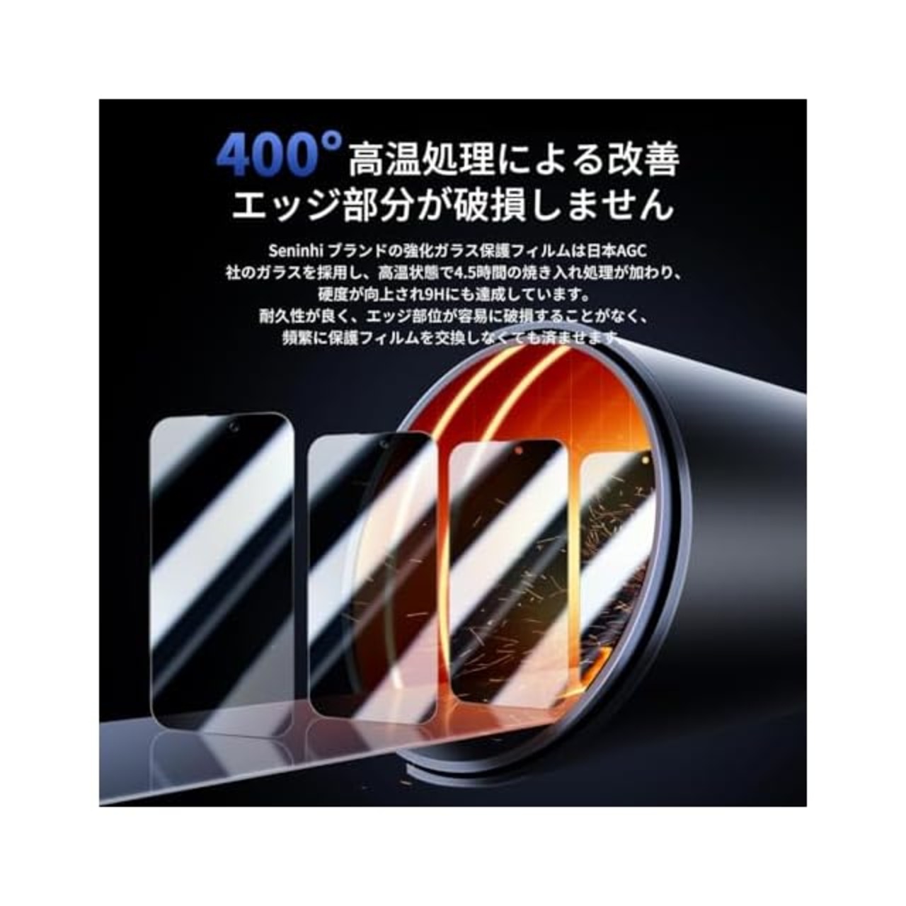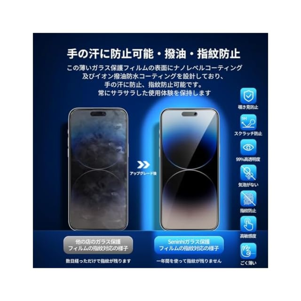 <b>【Seninhi】 iPhone 14 pro max プライバシーフィルム</b><br> <br><br>について 仕様</b><br> <br>厚さ: 0.26mm <br>素材:国産AGC旭硝子ガラス <br>対応機種:iPhone 14 pro max<br>【同梱品】 <br>2 × 強化ガラスフィルム (覗き見防止 )<br> 2 × 強化レンズフィルム <br> 1 × ガイド枠<br> 1 × 取扱説明書 <br>2 × スクリーンクリーニングキット <br><b>特徴</b> <br>【9h高硬度】 私たちの強化フィルムは国産AGC旭硝子ガラスを使用し、4.5時間の高温急冷と多重強化処理して、同じ厚さの通常のガラスフィルムに比べて約5倍の強さを持ち、ガラスフィルムは9Hの最も硬い表面硬度に達しました。ナイフなどの鋭いものでも傷を与えません。日常生活で気軽に対応できます。<br> 【飛散防止】 飛散防止を通して、万が一ガラスが割れても破片が飛散しなく、破片による重傷事故を減らして、とても安全です。<br> 【覗き見防止 】 特別なブラインド加工により、真正面から見ると高透過率ではっきり見えますが、画面を横から覗かれることを防ぐ180度ブラインド仕様 <br>【高感度タッチ】 この強化フィルムは0.26mmのゴールデン厚さを設計しており、防爆する同時に、感度が高いタッチ体験と連続タッチを確保し、高感度でスムーズなオンスクリーン操作を実現し、ガラスフィルムを取り付けない画面とほぼ同じような使用体験を与えます。高感度でスムーズなオンスクリーン操作は様々なゲーム アプリケーションに適用します。<br> 【99%以上の携帯電話ケースに干渉しない】 百件以上な携帯電話ケースをテストしましたが、適応率は 99%に達しました。高品質の接着剤を使用したので、携帯電話ケースに取り付けられている瞬間保護フィルムがわずかに浮き、軽く押すと気泡がきれいに消えます。<br> 【素人でも簡単に貼り付け】 ガラスフィルムの取扱説明書に張り付ける方法は詳しく記載したので、位置をよく合わせた後、上から軽く貼り付けると、シリコン吸着層が自動的に吸着し、気泡が発生しません。誰でも簡単に貼り付けられ、万が一失敗しても剥がして貼り直すことができます。<br><br><b> 三、ご注意事項:</b><br> 1.フィルムを貼り付ける前に、手をきれいに洗ってください。<br> 2.泡があれば、クロスを指に巻きつけて少しずつ絞りだしてください。<br> 3.貼り直しによる泡を防止するため、はがす際にフィルムの粘着面に手や物が触れないようご注意ください。<br> 4. 保護フィルムは過度の衝撃等を防止するものではありません。携帯電話の故障、紛失等の責任は負いかねます。<br><br><b> 四、アフターサービス ご購入日より180日以内に初期不良や、ヒビ・欠け・ホコリ混入・サイズ違い等の使用上の問題がございましたら、ご遠慮なく、いつでもお気軽にご連絡ください。私たちは具体的な問題により、お客様に満足できる解決策を提供します。</b>