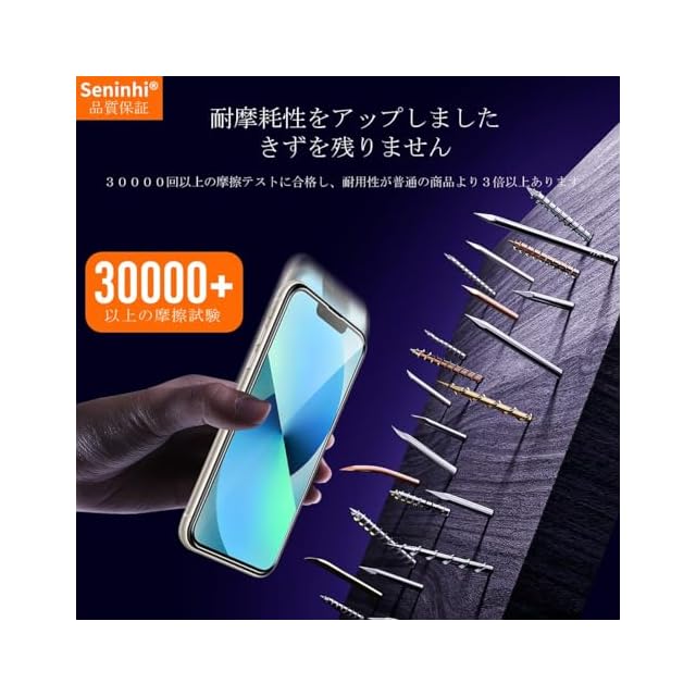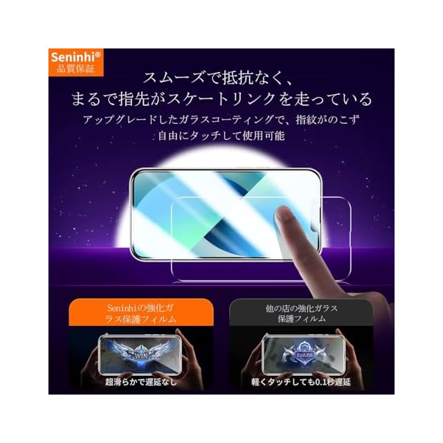 <b>【Seninhi】</b><br> iPhone 13 強化ガラス 保護フィルム<br> <b> 仕様 </b><br> 厚さ: 0.3mm <br>光透過率: 99% <br>素材:国産AGC旭硝子ガラス <br>対応機種:iPhone13 <br><b>【同梱品】</b><br> 2 × 強化ガラスフィルム<br> 2 × レンズ保護フィルム<br> 1 × 取扱説明書<br> 1 × ガイド枠 <br>2 × スクリーンクリーニングキット<br> 2 × ホコリ除去用ステッカー <br><br>特徴 <br><br><b>【9h高硬度】</b><br> 私たちの強化フィルムは国産AGC旭硝子ガラスを使用し、4.5時間の高温急冷と多重強化処理して、同じ厚さの通常のガラスフィルムに比べて約5倍の強さを持ち、ガラスフィルムは9Hの最も硬い表面硬度に達しました。ナイフなどの鋭いものでも傷を与えません。日常生活で気軽に対応できます。 <br><br><b> 【飛散防止】</b><br> 飛散防止を通して、万が一ガラスが割れても破片が飛散しなく、破片による重傷事故を減らして、とても安全です。<br><br><b> 【高感度タッチ】 </b><br> この強化フィルムは0.26mmのゴールデン厚さを設計しており、防爆する同時に、感度が高いタッチ体験と連続タッチを確保し、高感度でスムーズなオンスクリーン操作を実現し、ガラスフィルムを取り付けない画面とほぼ同じような使用体験を与えます。高感度でスムーズなオンスクリーン操作は様々なゲーム アプリケーションに適用します。 <br><br><b> 【99%以上の携帯電話ケースに干渉しない】 </b><br>百件以上な携帯電話ケースをテストしましたが、適応率は 99%に達しました。高品質の接着剤を使用したので、携帯電話ケースに取り付けられている瞬間保護フィルムがわずかに浮き、軽く押すと気泡がきれいに消えます。 <br><br><b> 【素人でも簡単に貼り付け】 </b><br> ガラスフィルムの取扱説明書に張り付ける方法は詳しく記載したので、位置をよく合わせた後、上から軽く貼り付けると、シリコン吸着層が自動的に吸着し、気泡が発生しません。誰でも簡単に貼り付けられ、万が一失敗しても剥がして貼り直すことができます。<br><br><b> 三、ご注意事項: </b><br> 1.フィルムを貼り付ける前に、手をきれいに洗ってください。<br> 2.泡があれば、クロスを指に巻きつけて少しずつ絞りだしてください。 <br> 3.貼り直しによる泡を防止するため、はがす際にフィルムの粘着面に手や物が触れないようご注意ください。 <br> 4. 保護フィルムは過度の衝撃等を防止するものではありません。携帯電話の故障、紛失等の責任は負いかねます。 <br><br>四、アフターサービス ご購入日より180日以内に初期不良や、ヒビ・欠け・ホコリ混入・サイズ違い等の使用上の問題がございましたら、ご遠慮なく、いつでもお気軽にご連絡ください。私たちは具体的な問題により、お客様に満足できる解決策を提供します。