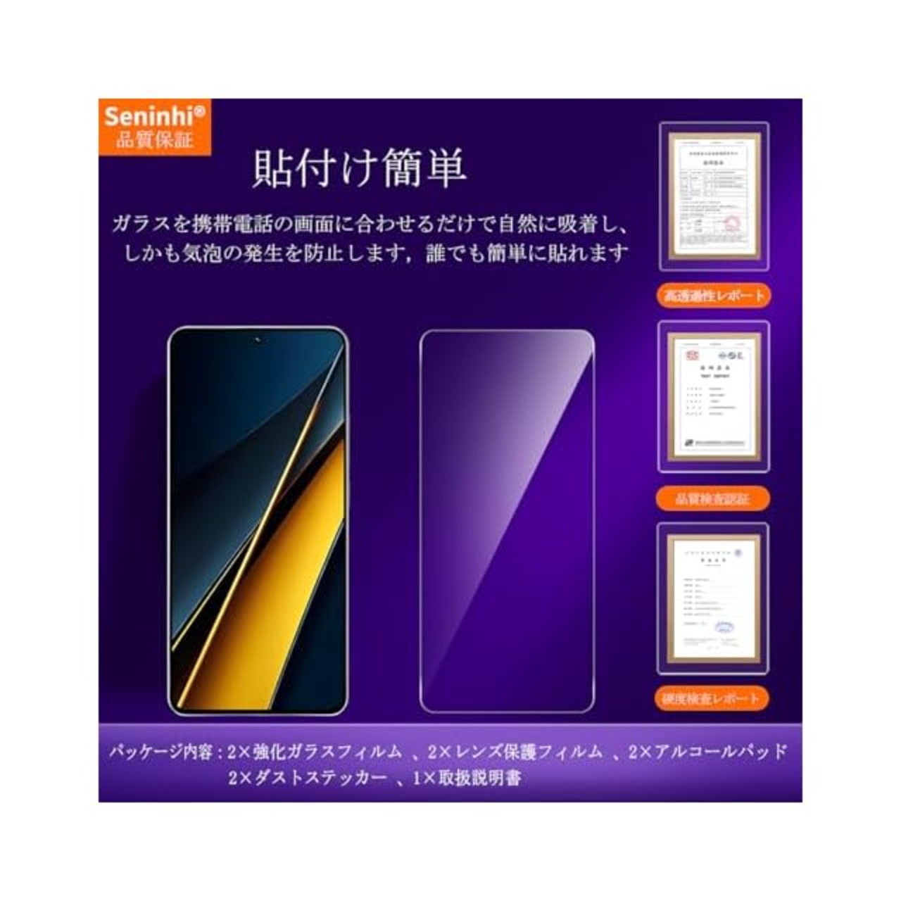 <b>【Seninhi】 Xiaomi Poco X6 Pro 強化ガラス 保護フィルム </b> <b><br>【について 仕様】</b> <br>硬度:9H <br>光透過率: 99% <br>素材:国産AGC旭硝子ガラス <br>対応機種:Xiaomi Poco X6 Pro <b><br>【同梱品】</b> <br>2 × 強化ガラスフィルム <br>2 × レンズ保護フィルム <br>2 × スクリーンクリーニングキット <br>2 × ホコリ除去用ステッカー 特徴 <br>1 × 取扱説明書 <b><br>【9h高硬度】 </b> <br>私たちの強化フィルムは日本AGC旭硝子ガラスを使用し、4.5時間の高温急冷と多重強化処理して、同じ厚さの通常のガラスフィルムに比べて約5倍の<br>強さを持ち、ガラスフィルムは9Hの最も硬い表面硬度に達しました。ナイフなどの鋭いものでも傷を与えません。日常生活で気軽に対応できます。 <b><br>【飛散防止】</b> <br> 飛散防止を通して、万が一ガラスが割れても破片が飛散しなく、破片による重傷事故を減らして、とても安全です。 <b><br>【高感度タッチ】 </b> <br>この強化フィルムは0.26mmのゴールデン厚さを設計しており、防爆する同時に、感度が高いタッチ体験と連続タッチを確保し、 <br>高感度でスムーズなオンスクリーン操作を実現し、ガラスフィルムを取り付けない画面とほぼ同じような使用体験を与えます。<br>高感度でスムーズなオンスクリーン操作は様々なゲーム アプリケーションに適用します。 <b> <br>【99%以上の携帯電話ケースに干渉しない】 </b> <br>百件以上な携帯電話ケースをテストしましたが、適応率は 99%に達しました。高品質の接着剤を使用したので、<br>携帯電話ケースに取り付けられている瞬間保護フィルムがわずかに浮き、軽く押すと気泡がきれいに消えます。 <b><br>【素人でも簡単に貼り付け】 </b> <br>ガラスフィルムの取扱説明書に張り付ける方法は詳しく記載したので、位置をよく合わせた後、上から軽く貼り付けると、 <br>シリコン吸着層が自動的に吸着し、気泡が発生しません。誰でも簡単に貼り付けられ、万が一失敗しても剥がして貼り直すことができます。 <b><br>【ご注意事項】</b> <br>1.フィルムを貼り付ける前に、手をきれいに洗ってください。 <br>2.泡があれば、クロスを指に巻きつけて少しずつ絞りだしてください。 <br>3.貼り直しによる泡を防止するため、はがす際にフィルムの粘着面に手や物が触れないようご注意ください。 <br>4. 保護フィルムは過度の衝撃等を防止するものではありません。携帯電話の故障、紛失等の責任は負いかねます。 <b><br>【ご注意】</b> <br>アフターサービス ご購入日より180日以内に初期不良や、ヒビ・欠け・ホコリ混入・サイズ違い等の使用上の問題がございましたら、ご遠慮なく、いつでもお気軽にご連絡ください。 <br>私たちは具体的な問題により、お客様に満足できる解決策を提供します。 <br> 商品はガラス製のため、貼り付け後の落下による破損は外となります。