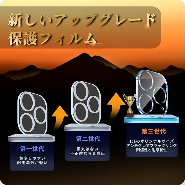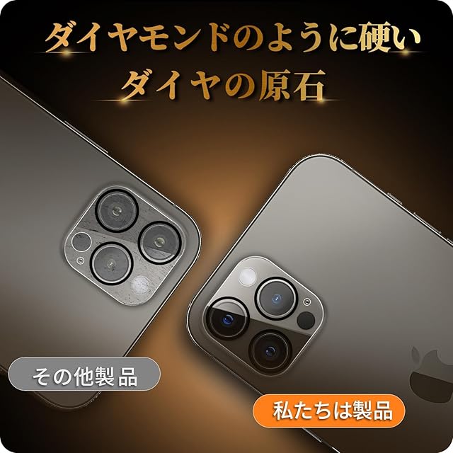 <br><b>対応 iPhone 12 Pro の カメラレンズ保護フィルムです。</b> <br> <br>カッターナイフを当てても傷が付きにくい、ガラスフィルムカメラ保護シート。 <br>液晶画面の鮮明度を損なうことなく、 強化ガラスでしっかり保護します。 <br> <br>·鋭利なものが当たっても傷が付きにくい表面硬度9H <br>·シートの厚さ0.26mm。ラウンドエッジ加工で滑らかな手触り。 <br>·指紋防止加工·耐オイルコーティングで表面はいつもきれい。 <br>·気泡が入りにくいのできれいに貼り付けられる。 <br>·万が一割れても心配なしの飛散防止加工。 <br> <br> <br><b>【指紋防止】</b> <br>指紋や汚れなどに強くなめらかな操作感を実現。付着した汚れも簡単に<br>拭き取ることができます。 <br> <br><b>【3D加工】</b> <br>全面フルカバータイプで3Dラウンドエッジ加工とガラスフィルムとしても高機能です。<br>曲面3D強化ガラスを貼ったら、画像の立体感アップします。 <br> <br><b>【貼り付け簡単】</b> <br>バブルレスで気泡ゼロ!誰でも驚くほど簡単に貼れてしまうガラスフィルム。<br>貼り付け場所を決めたら指で軽くおさえるだけ。 <br> <br><b>【使い方】</b> <br>·アルコールパッドで拭き、汚れを完全に落とします。 <br>·貼り付ける前に、予め貼る位置を確認します。 <br>·接着面のステッカーを剥がします。埃が付かないように注意してください。 <br>·貼り付け直前にカメラに埃がついていないか再確認してください。 <br>·カメラの上に軽く置きながら、位置を調整してください。 <br>·中央から外の方に、押しながら貼り付けます。 <br> <br><b>【製品仕様】</b> <br>対応機種: iPhone 12 Pro <br>硬度:9H <br> <br><b>【パッケージ内容】</b> <br>3x レンズ保護フィルム <br>3× 清潔ツール <br> <br><b>【製品】</b> <br>万が一製品にご満足いただけない場合は、弊社より180日以内に全額返金·交換対策がございますので、<br>ご遠慮なくご連絡ください。