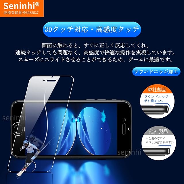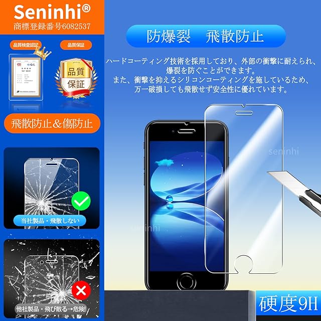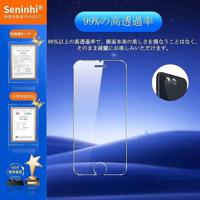<b><br>厚み0.26mmの強化ガラスを使用した、 iphone SE3 / SE2 / iPhone8 / iPhone7 の ガラスフィルム&液晶保護フィルムです。</b><br> <br> カッターナイフを当てても傷が付きにくい、ガラスフィルム液晶保護シート。 液晶画面の鮮明度を損なうことなく、 強化ガラスでしっかり保護します。<br><br> ·鋭利なものが当たっても傷が付きにくい表面硬度9H<br> ·シートの厚さ0.26mm。ラウンドエッジ加工で滑らかな手触り。<br> ·指紋防止加工·耐オイルコーティングで表面はいつもきれい。<br> ·気泡が入りにくいのできれいに貼り付けられる。<br> ·万が一割れても心配なしの飛散防止加工。<br> <br> <b>【超薄型】</b><br> 厚さは、僅か0.26mm、先端な技術を採用、超薄くでも保護性抜群。 <br><br> <b>【指紋防止】</b><br> 指紋や汚れなどに強くなめらかな操作感を実現。付着した汚れも簡単に拭き取ることができます。 <b><br><br>【3D加工】</b><br> 全面フルカバータイプで3Dラウンドエッジ加工とガラスフィルムとしても高機能です。曲面3D強化ガラスを貼ったら、画像の立体感アップします。<br> <b><br>【貼り付け簡単】</b><br> バブルレスで気泡ゼロ!誰でも驚くほど簡単に貼れてしまうガラスフィルム。貼り付け場所を決めたら指で軽くおさえるだけ。<br> <b><br>【使い方】</b><br> ·アルコールパッドで拭き、汚れを完全に落とします。 <br>·貼り付ける前に、予め貼る位置を確認します。 <br>·接着面のステッカーを剥がします。埃が付かないように注意してください。 <br>·貼り付け直前に液晶に埃がついていないか再確認してください。 <br>·液晶の上に軽く置きながら、位置を調整してください。 <br>·中央から外の方に、押しながら貼り付けます。 <br><br><b>【製品仕様】</b> <br>対応機種:iphone SE3 / SE2 / iPhone8 / iPhone7 <br>硬度:9H <br>厚さ:0.26mm<br><br> <b>【パッケージ内容】</b> <br>2×強化ガラス保護フィルム <br>2x レンズ保護フィルム <br>2×スクリーン清潔ツール <br><br><b>【製品】</b><br>万が一製品にご満足いただけない場合は、弊社より180日以内に全額返金·交換対策がございますので、ご遠慮なくご連絡ください。