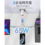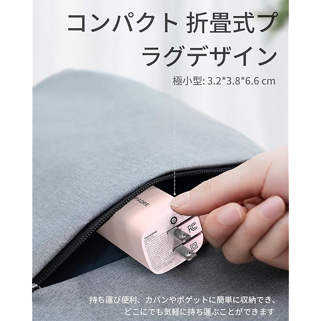 TOPADRE 65W GaN 3 IN 1急速充電器 – コンパクト・多ポート・高速充電のすべてを一つに 3ポート同時充電で効率化 Type-C×2(最大65W出力)+USB-A×1(最大30W出力)を搭載し、MacBook Pro/Air・スマホ・タブレットなど3台のデバイスを同時に急速充電可能。ノートPC充電はType-C単ポート使用時(65Wフル出力)に対応し、旅行・出張・自宅でワンランク上の利便性を実現。 超コンパクト&折り畳みプラグ サイズはわずか3.2×3.8×6.6cmと軽量小型。折り畳み式プラグでバッグやポケットにもすっきり収納。GaN(窒化ガリウム)技術により高出力かつ発熱を抑え、従来比でより小型・高効率を実現しました。 ⚡ 幅広い高速充電規格対応 PD3.0/QC4.0+/PPS/SCP/FCPなど主要規格を網羅。対応充電デバイス:iPhone 16/15シリーズ・Samsung Galaxy・iPad・各種USB-Cデバイスに最適な充電速度を自動検知。炭素繊維素材とシボ加工で耐久性も抜群です。 安心の安全設計 過電流・過熱・短絡保護を搭載し、接続機器を24時間保護。2年間のメーカーと24時間カスタマーサポートで、万一の際も迅速に対応します。 ▶ こんな方に最適! ・複数デバイスをスマートに充電したい ・コンセント混雑を解消したい ・旅行先でもPCとスマホを高速充電したい ※ご注意 ・ノートPC充電時はType-Cを単独でご使用ください。 ・付属のケーブルは別売りです。 1台で全てをカバーする充電器で、煩わしい配線ともおさらば!