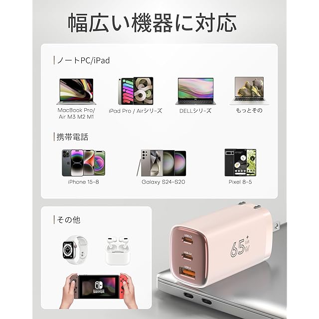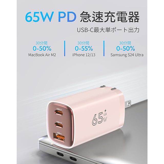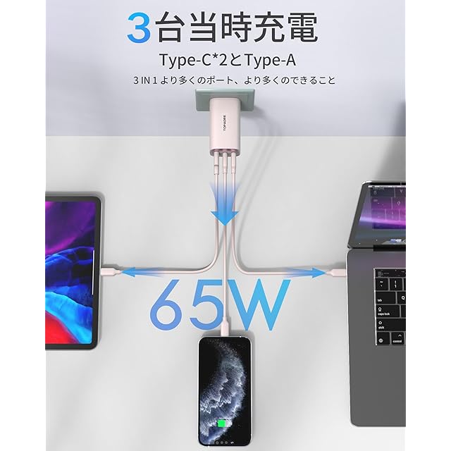 商品名:TOPADRE 急速充電器 65w PD 充電器 Type-C USB 3ポート三台同時充 電 [超低温/GaNIII技術/折りたたみ式プラグ] タイプc 充 電器 対応MacBook/iPad/Android/Windows PC PSE認証済 PD3.0 対応iphone 16/15/14/13 フルシリーズ対応 ピンク