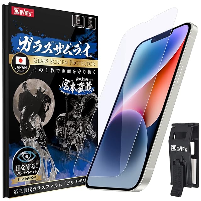 ガラスザムライ iPhone 14 用 ガラスフィルム ブルーライトカット 硬度 10H 国産AGC素材 強化ガラス 保護フィルム 米軍MIL規格 いPhone 360-blue
