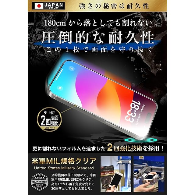 【最先端の第3世代技術】柔軟性と強度を兼ね備えた化学強化ガラスを採用。硬度25Hの高強度に加え、長期劣化に強い柔軟性をプラス。「より割れない」「より浮かない」「角割れしない」ガラスフィルムです