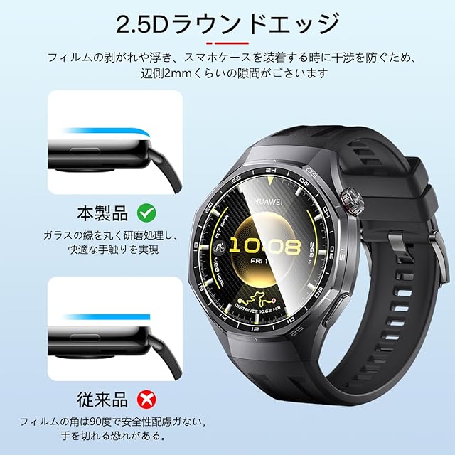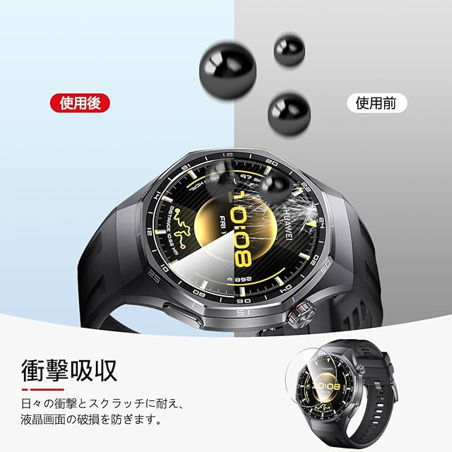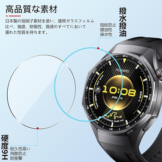 <b>対応機種:対応 HUAWEI WATCH GT 6 Pro 46mm</b> <br><b>購入前に対応機種をご確認よろしくお願い致します</b> <br><b>パッケージ内容</b> <br>3×強化ガラス保護フィルム<br>3×アルコールパッド<br>3×ダストステッカー<br>1×気泡除去ヘラ<br><b>厚み0.26mmの強化ガラスを使用した、対応 HUAWEI WATCH GT 6 Pro ガラスフィルム。日本製素材旭硝子製を採用しております、9Hの表面硬度を誇る強化ガラス,ナイフに触れても傷つきにくく</b><br><b>【製品特徴】</b> <br>①旭硝子素材硬度9H<br>②貼り付けが可能で、気泡が発生しにくいです<br>③高透過率&高感度タッチ<br>④撥水・撥油加工で指紋や皮脂の付着を防げ<br>⑤2.5D ラウンドエッジ仕様<br><b>【耐久性 安全性】</b> <br>日本製旭硝子素材の採用、9H硬度、強化ガラス 耐衝撃、スクラッチ防止。飛散防止加工、激しい衝撃を受けてもガラスフィルムは貼り付けのままでございます<br><b>【貼り付けやすい】</b> <br>気泡防止 アルコールパッド・クリーニングクロス・静電気ホコリ取りシートを使用することにより 気泡が入りにくく、誰でも簡単に貼り付けることができます<br><b>【99%高透過率】</b> <br>透過率99%超えのフィルムで、液晶画面の鮮明度を損なうことなく画面本来の美しさをそのまま表現,よい手触り感でしかもスムーズな操作感をご体験いただけます<br><b>【指紋防止】</b> <br>指紋防止、飛散防止 撥油コーティング加工されているため、耐油性に優れ、指紋がつきにくく、付着した汚れなどは簡単に拭きとれます<br><b>【スムーズな操作感】</b> <br>高感度タッチ 極薄の厚さでタッチスクリーンの反応を損なわず表面のオイル加工により快適な操作が可能。 <br>スクリーンにタッチするとすぐにフィードバックができます。遅延の心配はありません<br><b>貼り付け方法:</b><br>ステップ1:まず、付属の緑色の「1」ウェットシートでスクリーンに付いた汚れを拭きとります。<br>ステップ2:次に、ピンク色の「2」ドライシートで水滴や指紋などを拭きとります。<br>ステップ3:付属の青色シールを使って、ホコリやごみをきれいに拭きとります。<br>ステップ4:ガラスフィルムを設備に貼ります。揭下透明的胶卷贴纸。液晶の上に軽く置きながら、位置を調整してください。埃が付かないように注意してください。<br>ステップ5:中央から外の方に、押しながら貼り付けます。