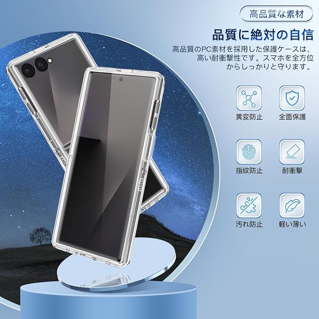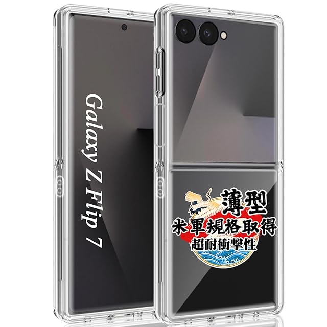 <b>対応機種:対応 Galaxy Z Flip 7 SC-55F / SCG35</b> <br><b>購入前に対応機種をご確認よろしくお願い致します</b>高品質のPC素材を採用した保護ケースは、スマホを全方位からしっかりと守ります。<br><b>【製品特徴】</b> <br>①超高耐衝撃性②滑りにくい③抜群な透明感④超精密なタッチ⑤ワイヤレス充電<br><b>【耐衝撃性、さらに強化】</b> <br>コンクリートの地面に厚さ5mmの合板を敷き、高さ1.2mから合計26回、違う角度から落下させる実験をしましたが、本体に傷はつきませんでした。<br>どんな衝撃的な旅にもスマホを守り抜く保護力を誇り、頑強なバリアを築き上げた。さらに、米国防総省が制定した米軍MIL規格に完勝し、業界最高の耐衝撃性を誇ることを証明しています。<br><b>【画面·カメラ保護】</b> <br>面と背面カメラ部のフチを高く設計し、液晶画面とカメラレンズをキズから保護します。<br>スマホを机などの平面に置いた場合に、液晶画面とカメラレンズが接触してできるキズが最小限に抑えられるよう、表側(液晶画面側)は1.2mmの、裏側(背面側)は1mmの高低差をつけ、ちゃんと携帯を保護することができます。<br><b>【精確な穴あけ加工】</b> <br>外周はPCで滑りにくく持ち易い上にクッション性も高いです、長く使っても熱がこもらない。<br>本体にぴったりフィイットするよう設計し、精巧をきわめていることの孔位で、充電するやイヤホンで音楽を聴くことにも支障なく使用でき、携帯へ負荷を掛けずに楽々装着できます。<br><b>【ワイヤレス充電対応】</b> <br>ケースはワイヤレス充電に対応しており、ケースを付けたまま充電器に置くだけで充電が可能。<br><b>【指紋防止】</b> <br>指紋防止、飛散防止 撥油コーティング加工されているため、耐油性に優れ、指紋がつきにくく、付着した汚れなどは簡単に拭きとれます<br><b>【簡単に脱着する方法】</b> <br>スマホを横向きに左手で持ち。右手の親指でギャラクシーZ Flip 7カメラの部分を上に押しながら、右手の差し指でスマホケース右上の角を下に押し出してケースを外す。