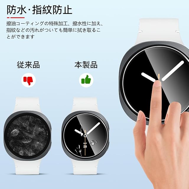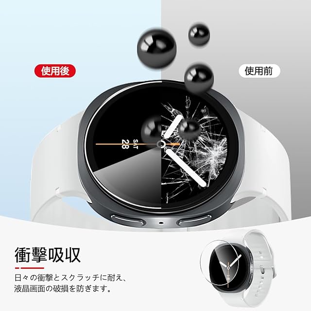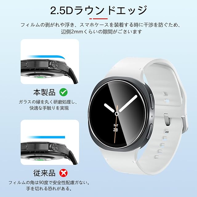 <b>対応機種:対応 galaxy watch 8 44mm</b> <br><b>購入前に対応機種をご確認よろしくお願い致します</b> <br><b>パッケージ内容</b> <br>3×強化ガラス保護フィルム<br>3×アルコールパッド<br>3×ダストステッカー<br>1×気泡除去ヘラ<br><b>厚み0.26mmの強化ガラスを使用した、対応 galaxy ウォッチ 8 44mm ガラスフィルム。日本製素材旭硝子製を採用しております、9Hの表面硬度を誇る強化ガラス,ナイフに触れても傷つきにくく</b><br><b>【製品特徴】</b> <br>①旭硝子素材硬度9H<br>②貼り付けが可能で、気泡が発生しにくいです<br>③高透過率&高感度タッチ<br>④撥水・撥油加工で指紋や皮脂の付着を防げ<br>⑤2.5D ラウンドエッジ仕様<br><b>【耐久性 安全性】</b> <br>日本製旭硝子素材の採用、9H硬度、強化ガラス 耐衝撃、スクラッチ防止。飛散防止加工、激しい衝撃を受けてもガラスフィルムは貼り付けのままでございます<br><b>【貼り付けやすい】</b> <br>気泡防止 アルコールパッド・クリーニングクロス・静電気ホコリ取りシートを使用することにより 気泡が入りにくく、誰でも簡単に貼り付けることができます<br><b>【99%高透過率】</b> <br>透過率99%超えのフィルムで、液晶画面の鮮明度を損なうことなく画面本来の美しさをそのまま表現,よい手触り感でしかもスムーズな操作感をご体験いただけます<br><b>【指紋防止】</b> <br>指紋防止、飛散防止 撥油コーティング加工されているため、耐油性に優れ、指紋がつきにくく、付着した汚れなどは簡単に拭きとれます<br><b>【スムーズな操作感】</b> <br>高感度タッチ 極薄の厚さでタッチスクリーンの反応を損なわず表面のオイル加工により快適な操作が可能。 <br>スクリーンにタッチするとすぐにフィードバックができます。遅延の心配はありません<br><b>貼り付け方法:</b><br>ステップ1:まず、付属の緑色の「1」ウェットシートでスクリーンに付いた汚れを拭きとります。<br>ステップ2:次に、ピンク色の「2」ドライシートで水滴や指紋などを拭きとります。<br>ステップ3:付属の青色シールを使って、ホコリやごみをきれいに拭きとります。<br>ステップ4:ガラスフィルムを設備に貼ります。揭下透明的胶卷贴纸。液晶の上に軽く置きながら、位置を調整してください。埃が付かないように注意してください。<br>ステップ5:中央から外の方に、押しながら貼り付けます。