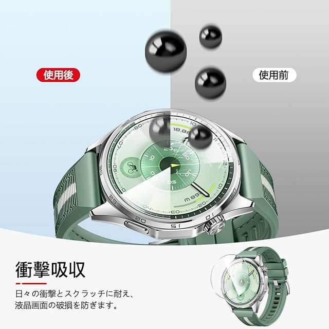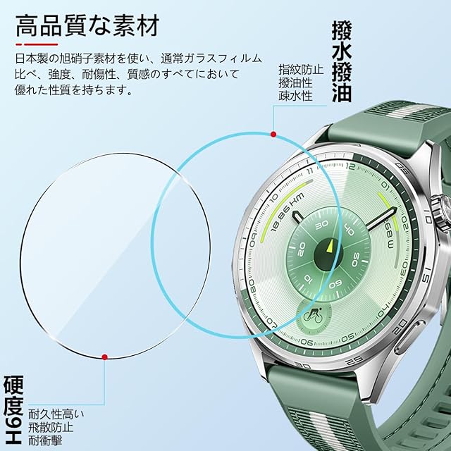 <b>対応機種:対応 HUAWEI WATCH GT 6</b> <br><b>購入前に対応機種をご確認よろしくお願い致します</b> <br><b>パッケージ内容</b> <br>3×強化ガラス保護フィルム<br>3×アルコールパッド<br>3×ダストステッカー<br>1×気泡除去ヘラ<br><b>厚み0.26mmの強化ガラスを使用した、対応 HUAWEI WATCH GT 6 46mm ガラスフィルム。日本製素材旭硝子製を採用しております、9Hの表面硬度を誇る強化ガラス,ナイフに触れても傷つきにくく</b><br><b>【製品特徴】</b> <br>①旭硝子素材硬度9H<br>②貼り付けが可能で、気泡が発生しにくいです<br>③高透過率&高感度タッチ<br>④撥水・撥油加工で指紋や皮脂の付着を防げ<br>⑤2.5D ラウンドエッジ仕様<br><b>【耐久性 安全性】</b> <br>日本製旭硝子素材の採用、9H硬度、強化ガラス 耐衝撃、スクラッチ防止。飛散防止加工、激しい衝撃を受けてもガラスフィルムは貼り付けのままでございます<br><b>【貼り付けやすい】</b> <br>気泡防止 アルコールパッド・クリーニングクロス・静電気ホコリ取りシートを使用することにより 気泡が入りにくく、誰でも簡単に貼り付けることができます<br><b>【99%高透過率】</b> <br>透過率99%超えのフィルムで、液晶画面の鮮明度を損なうことなく画面本来の美しさをそのまま表現,よい手触り感でしかもスムーズな操作感をご体験いただけます<br><b>【指紋防止】</b> <br>指紋防止、飛散防止 撥油コーティング加工されているため、耐油性に優れ、指紋がつきにくく、付着した汚れなどは簡単に拭きとれます<br><b>【スムーズな操作感】</b> <br>高感度タッチ 極薄の厚さでタッチスクリーンの反応を損なわず表面のオイル加工により快適な操作が可能。 <br>スクリーンにタッチするとすぐにフィードバックができます。遅延の心配はありません<br><b>貼り付け方法:</b><br>ステップ1:まず、付属の緑色の「1」ウェットシートでスクリーンに付いた汚れを拭きとります。<br>ステップ2:次に、ピンク色の「2」ドライシートで水滴や指紋などを拭きとります。<br>ステップ3:付属の青色シールを使って、ホコリやごみをきれいに拭きとります。<br>ステップ4:ガラスフィルムを設備に貼ります。揭下透明的胶卷贴纸。液晶の上に軽く置きながら、位置を調整してください。埃が付かないように注意してください。<br>ステップ5:中央から外の方に、押しながら貼り付けます。