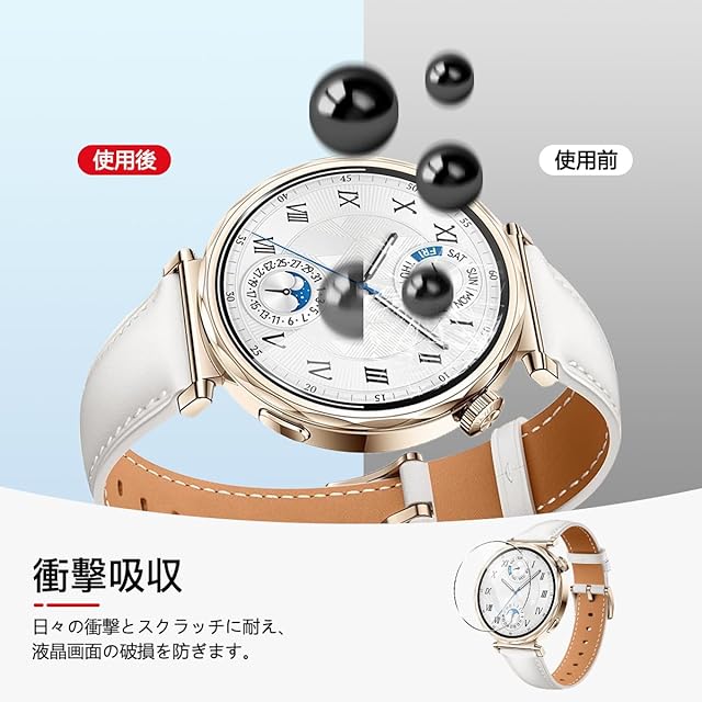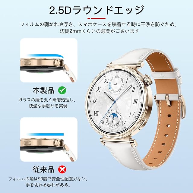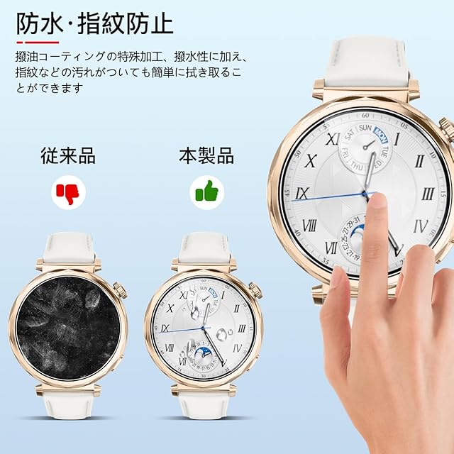<b>対応機種:対応 HUAWEI WATCH GT5 41mm</b> <br><b>購入前に対応機種をご確認よろしくお願い致します</b> <br><b>パッケージ内容</b> <br>3×強化ガラス保護フィルム<br>3×アルコールパッド<br>3×ダストステッカー<br>1×気泡除去ヘラ<br><b>厚み0.26mmの強化ガラスを使用した、対応 ファーウェイ GT5 Pro 41mm ガラスフィルム。日本製素材旭硝子製を採用しております、9Hの表面硬度を誇る強化ガラス,ナイフに触れても傷つきにくく</b><br><b>【製品特徴】</b> <br>①旭硝子素材硬度9H<br>②貼り付けが可能で、気泡が発生しにくいです<br>③高透過率&高感度タッチ<br>④撥水・撥油加工で指紋や皮脂の付着を防げ<br>⑤2.5D ラウンドエッジ仕様<br><b>【耐久性 安全性】</b> <br>日本製旭硝子素材の採用、9H硬度、強化ガラス 耐衝撃、スクラッチ防止。飛散防止加工、激しい衝撃を受けてもガラスフィルムは貼り付けのままでございます<br><b>【貼り付けやすい】</b> <br>気泡防止 アルコールパッド・クリーニングクロス・静電気ホコリ取りシートを使用することにより 気泡が入りにくく、誰でも簡単に貼り付けることができます<br><b>【99%高透過率】</b> <br>透過率99%超えのフィルムで、液晶画面の鮮明度を損なうことなく画面本来の美しさをそのまま表現,よい手触り感でしかもスムーズな操作感をご体験いただけます<br><b>【指紋防止】</b> <br>指紋防止、飛散防止 撥油コーティング加工されているため、耐油性に優れ、指紋がつきにくく、付着した汚れなどは簡単に拭きとれます<br><b>【スムーズな操作感】</b> <br>高感度タッチ 極薄の厚さでタッチスクリーンの反応を損なわず表面のオイル加工により快適な操作が可能。 <br>スクリーンにタッチするとすぐにフィードバックができます。遅延の心配はありません<br><b>貼り付け方法:</b><br>ステップ1:まず、付属の緑色の「1」ウェットシートでスクリーンに付いた汚れを拭きとります。<br>ステップ2:次に、ピンク色の「2」ドライシートで水滴や指紋などを拭きとります。<br>ステップ3:付属の青色シールを使って、ホコリやごみをきれいに拭きとります。<br>ステップ4:ガラスフィルムを設備に貼ります。揭下透明的胶卷贴纸。液晶の上に軽く置きながら、位置を調整してください。埃が付かないように注意してください。<br>ステップ5:中央から外の方に、押しながら貼り付けます。