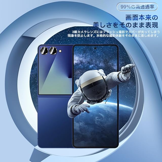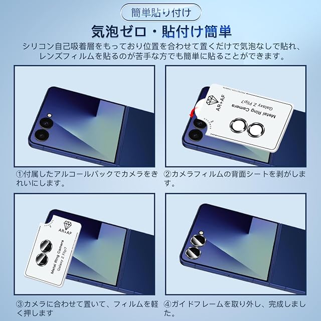 <b>対応機種:対応 Galaxy Z Flip 7 SC-55F / SCG35 </b> <br><b>購入前に対応機種をご確認よろしくお願い致します</b> <br><b>パッケージ内容</b> <br>2×強化カメラ保護フィルム<br>2×アルコールパッド<br>2×ダストステッカー<br>1x取扱説明書<br><b>厚み0.26mmの強化ガラスを使用した、対応 ギャラクシーZ Flip 7 レンズフィルム。日本製素材旭硝子製を採用しております、9Hの表面硬度を誇る強化ガラス,ナイフに触れても傷つきにくく</b><br><b>【製品特徴】</b> <br>①旭硝子素材硬度9H<br>②貼り付けが可能で、気泡が発生しにくいです<br>③高透過率&露出オーバー防止<br>④撥水・撥油加工で指紋や皮脂の付着を防げ<br>⑤2.5D ラウンドエッジ仕様<br><b>【耐久性 安全性】</b> <br>日本製旭硝子素材の採用+アルミ合金製、9H硬度、強化ガラス 耐衝撃、スクラッチ防止。飛散防止加工、激しい衝撃を受けてもカメラフィルムは貼り付けのままでございます<br><b>【貼り付けやすい】</b> <br>気泡防止 アルコールパッド・クリーニングクロス・静電気ホコリ取りシートを使用することにより 気泡が入りにくく、誰でも簡単に貼り付けることができます<br><b>【99%高透過率】</b> <br>透過率99%超えのフィルムで、液晶画面の鮮明度を損なうことなく画面本来の美しさをそのまま表現。<br><b>【指紋防止】</b> <br>指紋防止、飛散防止 撥油コーティング加工されているため、耐油性に優れ、指紋がつきにくく、付着した汚れなどは簡単に拭きとれます<br><b>パッケージ内容</b> <br>2×強化カメラ保護フィルム<br>2×アルコールパッド<br>2×ダストステッカー<br><b>貼り付け方法:</b><br>ステップ1:まず、付属の緑色の「1」ウェットシートでスマートフォン用レンズに付いた汚れを拭きとります。<br>ステップ2:次に、ピンク色の「2」ドライシートで水滴や指紋などを拭きとります。<br>ステップ3:付属の青色シールを使って、ホコリやごみをきれいに拭きとります。<br>ステップ4:カメラフィルムの背面シートを剥がします。カメラに合わせて置いて、フィルムを軽く押します。<br>ステップ5:ガイドフレームを取り外し、完成しました。<br><b>ご注意:</b><br>携帯電話のレンズに丁寧に貼り付けると、カメラフィルムは自動的に携帯電話のレンズに吸着するため、空気は自然に抜けますが、それでも中に空気が残っている場合は、カメラフィルムを指で軽く押すことで、気泡を外に出すことができます。
