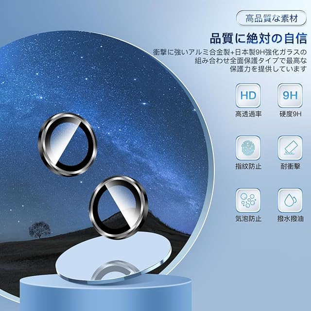 ★【業界最高硬度·耐衝撃性!】衝撃に強いアルミ合金製+日本製9H強化ガラスの組み合わせ全面保護タイプで最高な保護力を提供しています、またハードコーティング技術により、1メートルから30回約10kgの落下耐荷重試験に合格します,レンズフィルムの周りにアルミニウム材質で擦り傷や衝撃からカメラレンズをしっかりと守られます。アルミ合金製なので 耐久性は普通のガラス製のカメラフィルムより5倍UP!日常生活中に、うっかりカッター、キー、コインなどの鋭利のものを当てても傷がつきなく、耐久性がつよいです。また、飛散防止加工され、万が一ガラスが破損した場合、飛び散らず破片は張り付いた状態になり、使用者の安全を確保します。