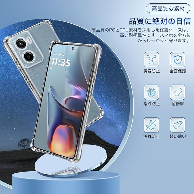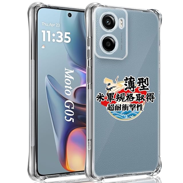 <b>対応機種:対応 Moto G05</b> <br><b>購入前に対応機種をご確認よろしくお願い致します</b>高品質のPCとTPU素材を採用した保護ケースは、四隅には高耐震クッションを搭載しており、高い耐衝撃性です。スマホを全方位からしっかりと守ります。<br><b>【製品特徴】</b> <br>①超高耐衝撃性②滑りにくい③抜群な透明感④超精密なタッチ⑤ワイヤレス充電<br><b>【耐衝撃性、さらに強化】</b> <br>コンクリートの地面に厚さ5mmの合板を敷き、高さ1.2mから合計26回、違う角度から落下させる実験をしましたが、本体に傷はつきませんでした。<br>どんな衝撃的な旅にもスマホを守り抜く保護力を誇り、頑強なバリアを築き上げた。さらに、米国防総省が制定した米軍MIL規格に完勝し、業界最高の耐衝撃性を誇ることを証明しています。<br><b>【画面·カメラ保護】</b> <br>面と背面カメラ部のフチを高く設計し、液晶画面とカメラレンズをキズから保護します。<br>スマホを机などの平面に置いた場合に、液晶画面とカメラレンズが接触してできるキズが最小限に抑えられるよう、表側(液晶画面側)は1.2mmの、裏側(背面側)は1mmの高低差をつけ、ちゃんと携帯を保護することができます。<br><b>【精確な穴あけ加工】</b> <br>外周はTPU(ウレタン樹脂)で滑りにくく持ち易い上にクッション性も高いです、長く使っても熱がこもらない。<br>本体にぴったりフィイットするよう設計し、精巧をきわめていることの孔位で、充電するやイヤホンで音楽を聴くことにも支障なく使用でき、携帯へ負荷を掛けずに楽々装着できます。<br><b>【ワイヤレス充電対応】</b> <br>ケースはワイヤレス充電に対応しており、ケースを付けたまま充電器に置くだけで充電が可能。<br><b>【指紋防止】</b> <br>指紋防止、飛散防止 撥油コーティング加工されているため、耐油性に優れ、指紋がつきにくく、付着した汚れなどは簡単に拭きとれます<br><b>【簡単に脱着する方法】</b> <br>スマホを横向きに左手で持ち。右手の親指でモトローラ G05カメラの部分を上に押しながら、右手の差し指でスマホケース右上の角を下に押し出してケースを外す。