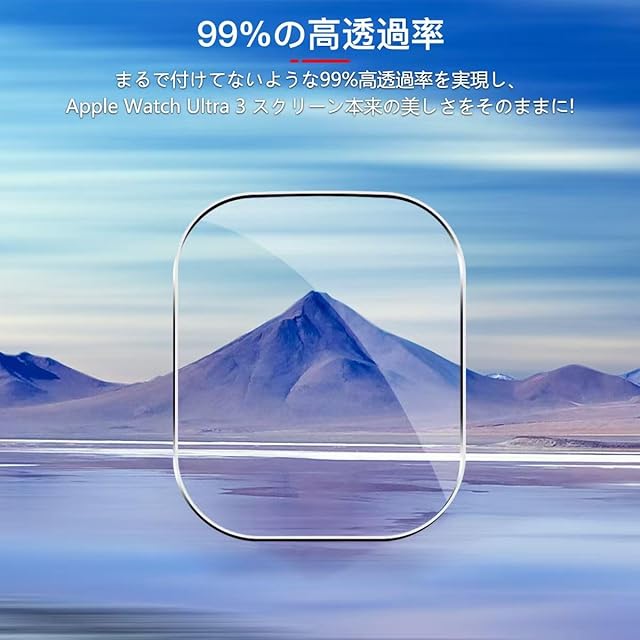 <b>対応機種:対応 Apple Watch Ultra 3</b> <br><b>購入前に対応機種をご確認よろしくお願い致します</b> <br><b>パッケージ内容</b> <br>3×強化ガラス保護フィルム<br>3×アルコールパッド<br>3×ダストステッカー<br>1×気泡除去ヘラ<br><b>厚み0.26mmの強化ガラスを使用した、対応 アップルウォッチ Ultra 3 ガラスフィルム。日本製素材旭硝子製を採用しております、9Hの表面硬度を誇る強化ガラス,ナイフに触れても傷つきにくく</b><br><b>【製品特徴】</b> <br>①旭硝子素材硬度9H<br>②貼り付けが可能で、気泡が発生しにくいです<br>③高透過率&高感度タッチ<br>④撥水・撥油加工で指紋や皮脂の付着を防げ<br>⑤2.5D ラウンドエッジ仕様<br><b>【耐久性 安全性】</b> <br>日本製旭硝子素材の採用、9H硬度、強化ガラス 耐衝撃、スクラッチ防止。飛散防止加工、激しい衝撃を受けてもガラスフィルムは貼り付けのままでございます<br><b>【貼り付けやすい】</b> <br>気泡防止 アルコールパッド・クリーニングクロス・静電気ホコリ取りシートを使用することにより 気泡が入りにくく、誰でも簡単に貼り付けることができます<br><b>【99%高透過率】</b> <br>透過率99%超えのフィルムで、液晶画面の鮮明度を損なうことなく画面本来の美しさをそのまま表現,よい手触り感でしかもスムーズな操作感をご体験いただけます<br><b>【指紋防止】</b> <br>指紋防止、飛散防止 撥油コーティング加工されているため、耐油性に優れ、指紋がつきにくく、付着した汚れなどは簡単に拭きとれます<br><b>【スムーズな操作感】</b> <br>高感度タッチ 極薄の厚さでタッチスクリーンの反応を損なわず表面のオイル加工により快適な操作が可能。 <br>スクリーンにタッチするとすぐにフィードバックができます。遅延の心配はありません<br><b>貼り付け方法:</b><br>ステップ1:まず、付属の緑色の「1」ウェットシートでスクリーンに付いた汚れを拭きとります。<br>ステップ2:次に、ピンク色の「2」ドライシートで水滴や指紋などを拭きとります。<br>ステップ3:付属の青色シールを使って、ホコリやごみをきれいに拭きとります。<br>ステップ4:ガラスフィルムを設備に貼ります。揭下透明的胶卷贴纸。液晶の上に軽く置きながら、位置を調整してください。埃が付かないように注意してください。<br>ステップ5:中央から外の方に、押しながら貼り付けます。