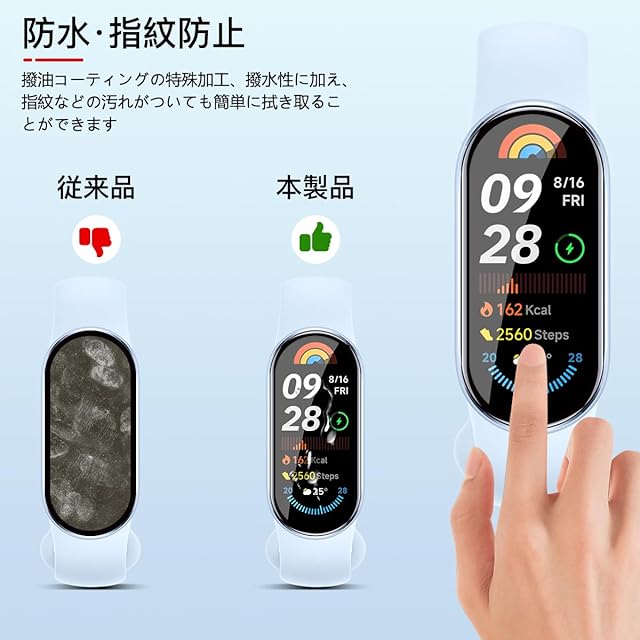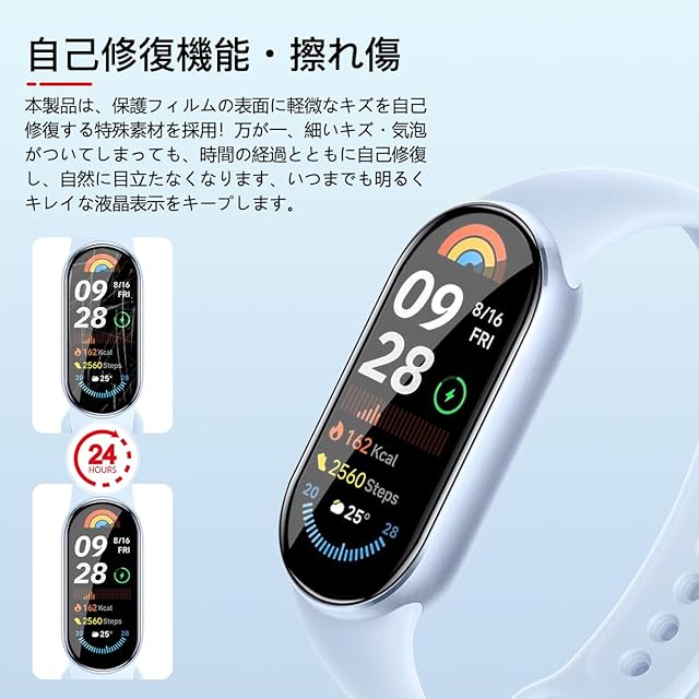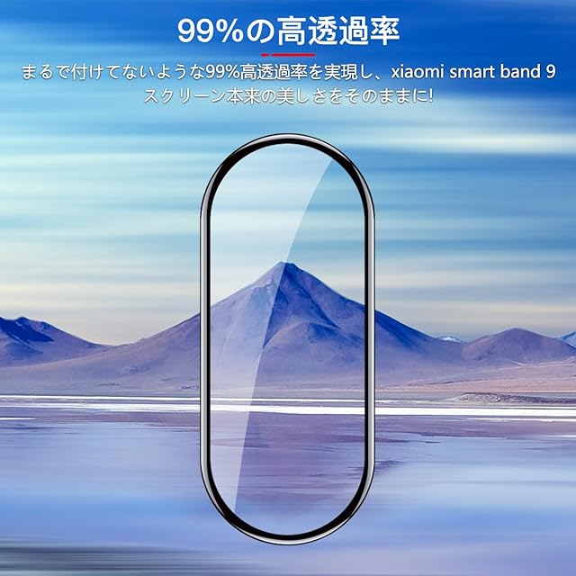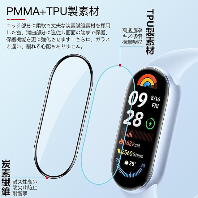 <b>対応機種:対応 Xiaomi Smart Band 9</b> <br><b>購入前に対応機種をご確認よろしくお願い致します</b> <br><b>パッケージ内容</b> <br>3×全面保護フィルム<br>1x取扱説明書<br>1x気泡除去ヘラ<br><b>非常に柔らかいウレタン素材を採用する事により、湾曲部分に追従し画面の端まで保護することができ、シャオミ スマートバンド band 9 独自のデザインを損なわず、まるでフィルムを貼ってないような仕上がりになります。</b><br><b>【製品特徴】</b> <br>①高品質のTPU素材<br>②貼り付けが可能で、気泡が発生しにくいです<br>③高透過率&高感度タッチ<br>④撥水・撥油加工で指紋や皮脂の付着を防げ<br>⑤キズ修復機能<br><b>【柔らかいTPU素材】</b><br>PMMA+TPU製素材、エッジ部分に柔軟で丈夫な炭素繊維素材を採用した為、湾曲部分に追従し画面の端まで保護、保護機能を更に強化させます!さらに、ガラスと違い、割れる心配もありません。<br><b>【キズレスと気泡レス】</b><br>優れた伸縮性を持っていて、フィルム表面の細いキズと貼り付け時に小さい気泡が発生てしまった場合、通常24時間内で消えます。<br><b>【貼り付けやすい】</b> <br>気泡防止 アルコールパッド・クリーニングクロス・静電気ホコリ取りシートを使用することにより 気泡が入りにくく、誰でも簡単に貼り付けることができます<br><b>【99%高透過率】</b> <br>透過率99%超えのフィルムで、液晶画面の鮮明度を損なうことなく画面本来の美しさをそのまま表現,よい手触り感でしかもスムーズな操作感をご体験いただけます<br><b>【指紋防止】</b> <br>指紋防止、撥油コーティング加工されているため、耐油性に優れ、指紋がつきにくく、付着した汚れなどは簡単に拭きとれます<br><b>【3D設計】</b> <br>画面の曲面に沿った3D設計で、端末のデザインを損なわずに衝撃から守るフルカバーフィルム、 市販の99%の保護ケースと干渉しなく、相性が良いものです。<br><b>【スムーズな操作感】</b> <br>高感度タッチ 極薄の厚さでタッチスクリーンの反応を損なわず表面のオイル加工により快適な操作が可能。<br>スクリーンにタッチするとすぐにフィードバックができます。遅延の心配はありません<br><b>貼り付け方法:</b><br>ステップ1:アルコールパッドを使ってスクリーンの汚れを拭き取リます。<br>その後、乾いた布でスクリーンをさらに徹底的にぬぐい取ってください。<br>[1]はアルコールパック[2]は乾いた布<br>ステップ2:ダストステッカー(ホコリ除去シール)で軽く叩いて、スクリーンに残っている小さなホコリを取り除きます。<br>ステップ3:保護フィルムを分離するために底部キャリアシートを曲げます。ホコリがつかないように注意してくさい。<br>ステップ4:保護フィルムを液晶画面に合わせてゆっくりと貼り付けてください。<br>ステップ5:保護フィルムの中央を軽く押して、液晶画面に自動的に吸着させます、さらに気泡除去ヘラで余分な気泡を拭き取る。<br>ステップ6:貼り付けてから、再度クロスで保護フィルムを拭きます。
