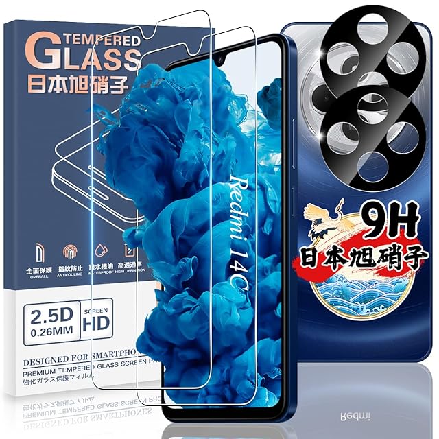 対応 Redmi 14C ガラスフィルム 2枚 + カメラフィルム 2枚 【4枚セット 日本旭硝子製】対応 シャオミ Redmi 14C フィルム 強化ガラス 液晶 保護フィルム ケース 指紋認証対応 硬度9H 耐衝撃 指紋防止 自動吸着 気泡ゼロ 貼り付け簡単