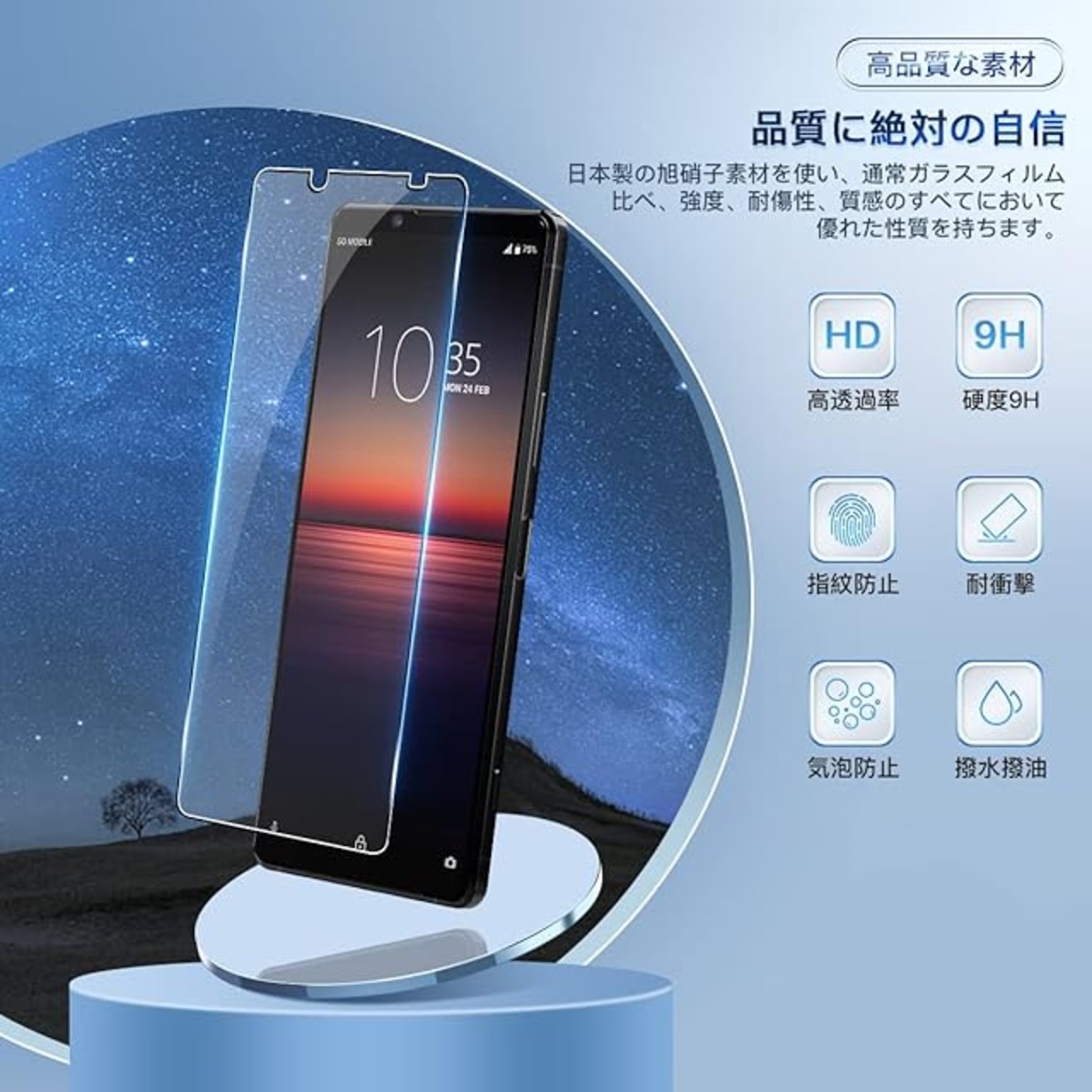 <b>対応機種:対応 Xperia 1 II SO-51A SOG01</b> <br><b>購入前に対応機種をご確認よろしくお願い致します</b> <br><b>厚み0.26mmの強化ガラスを使用した、対応 Xperia 1 II ガラスフィルム。日本製素材旭硝子製を採用しております、9Hの表面硬度を誇る強化ガラス,ナイフに触れても傷つきにくく</b><br><b>【製品特徴】</b> <br>①旭硝子素材硬度9H<br>②貼り付けが可能で、気泡が発生しにくいです<br>③高透過率&高感度タッチ<br>④撥水・撥油加工で指紋や皮脂の付着を防げ<br>⑤2.5D ラウンドエッジ仕様<br><b>【耐久性 安全性】</b> <br>日本製旭硝子素材の採用、9H硬度、強化ガラス 耐衝撃、スクラッチ防止。飛散防止加工、激しい衝撃を受けてもガラスフィルムは貼り付けのままでございます<br><b>【貼り付けやすい】</b> <br>気泡防止 アルコールパッド・クリーニングクロス・静電気ホコリ取りシートを使用することにより 気泡が入りにくく、誰でも簡単に貼り付けることができます<br><b>【99%高透過率】</b> <br>透過率99%超えのフィルムで、液晶画面の鮮明度を損なうことなく画面本来の美しさをそのまま表現,よい手触り感でしかもスムーズな操作感をご体験いただけます<br><b>【指紋防止】</b> <br>指紋防止、飛散防止 撥油コーティング加工されているため、耐油性に優れ、指紋がつきにくく、付着した汚れなどは簡単に拭きとれます<br><b>【2.5D加工】</b> <br>2.5Dラウンドエッジ処理でフィルムの角を丸く加工することで、装用時もスマホ角部分の違和感が無く高級感がアップ、 市販の99%の保護ケースと干渉しなく、相性が良いものです。<br><b>【スムーズな操作感】</b> <br>高感度タッチ 極薄の厚さでタッチスクリーンの反応を損なわず表面のオイル加工により快適な操作が可能。スクリーンにタッチするとすぐにフィードバックができます。遅延の心配はありません<br><b>パッケージ内容</b> <br>2×強化ガラス保護フィルム <br>2×カメラフィルム<br>4×アルコールパッド<br>4×ダストステッカー<br>1x取扱説明書<br><b>貼り付け方法:</b><br>ステップ1:まず、付属の緑色の「1」ウェットシートでスクリーンに付いた汚れを拭きとります。<br>ステップ2:次に、ピンク色の「2」ドライシートで水滴や指紋などを拭きとります。<br>ステップ3:付属の青色シールを使って、ホコリやごみをきれいに拭きとります。<br>ステップ4:ガラスフィルムをスマートフォンに貼ります。揭下透明的胶卷贴纸。液晶の上に軽く置きながら、位置を調整してください。埃が付かないように注意してください。<br>ステップ5:中央から外の方に、押しながら貼り付けます。