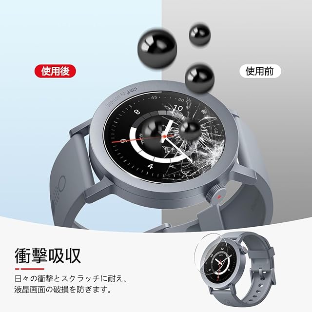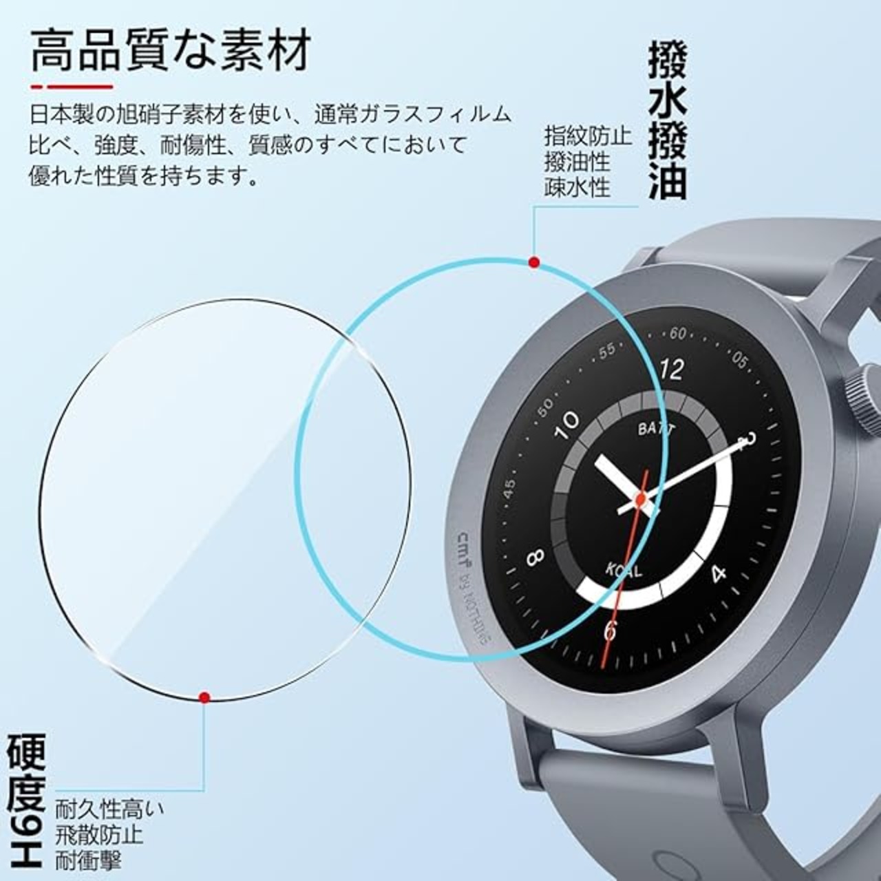 <b>対応機種:対応 CMF by Nothing WATCH PRO 2</b> <br><b>購入前に対応機種をご確認よろしくお願い致します</b> <br><b>パッケージ内容</b> <br>3×強化ガラス保護フィルム<br>3×アルコールパッド<br>3×ダストステッカー<br>1×気泡除去ヘラ<br><b>厚み0.26mmの強化ガラスを使用した、対応 Nothing WATCH PRO ガラスフィルム。日本製素材旭硝子製を採用しております、9Hの表面硬度を誇る強化ガラス,ナイフに触れても傷つきにくく</b><br><b>【製品特徴】</b> <br>①旭硝子素材硬度9H<br>②貼り付けが可能で、気泡が発生しにくいです<br>③高透過率&高感度タッチ<br>④撥水・撥油加工で指紋や皮脂の付着を防げ<br>⑤2.5D ラウンドエッジ仕様<br><b>【耐久性 安全性】</b> <br>日本製旭硝子素材の採用、9H硬度、強化ガラス 耐衝撃、スクラッチ防止。飛散防止加工、激しい衝撃を受けてもガラスフィルムは貼り付けのままでございます<br><b>【貼り付けやすい】</b> <br>気泡防止 アルコールパッド・クリーニングクロス・静電気ホコリ取りシートを使用することにより 気泡が入りにくく、誰でも簡単に貼り付けることができます<br><b>【99%高透過率】</b> <br>透過率99%超えのフィルムで、液晶画面の鮮明度を損なうことなく画面本来の美しさをそのまま表現,よい手触り感でしかもスムーズな操作感をご体験いただけます<br><b>【指紋防止】</b> <br>指紋防止、飛散防止 撥油コーティング加工されているため、耐油性に優れ、指紋がつきにくく、付着した汚れなどは簡単に拭きとれます<br><b>【スムーズな操作感】</b> <br>高感度タッチ 極薄の厚さでタッチスクリーンの反応を損なわず表面のオイル加工により快適な操作が可能。 <br>スクリーンにタッチするとすぐにフィードバックができます。遅延の心配はありません<br><b>貼り付け方法:</b><br>ステップ1:まず、付属の緑色の「1」ウェットシートでスクリーンに付いた汚れを拭きとります。<br>ステップ2:次に、ピンク色の「2」ドライシートで水滴や指紋などを拭きとります。<br>ステップ3:付属の青色シールを使って、ホコリやごみをきれいに拭きとります。<br>ステップ4:ガラスフィルムを設備に貼ります。揭下透明的胶卷贴纸。液晶の上に軽く置きながら、位置を調整してください。埃が付かないように注意してください。<br>ステップ5:中央から外の方に、押しながら貼り付けます。