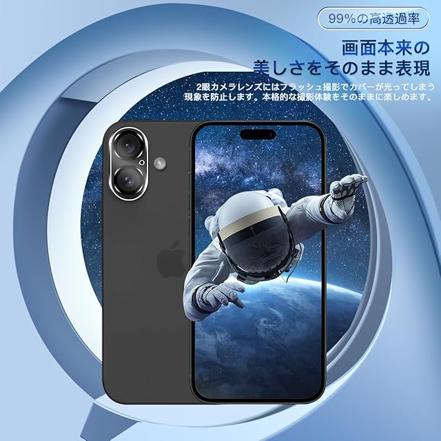 <b>対応機種:対応 アイフォン16/アイフォン16Plus</b> <br><b>購入前に対応機種をご確認よろしくお願い致します</b> <br><b>パッケージ内容</b> <br>2×強化カメラ保護フィルム<br>2×ダストステッカー<br>1x取扱説明書<br><b>厚み0.26mmの強化ガラスを使用した、対応 いPhone16/いPhone16Plus レンズフィルム。日本製素材旭硝子製を採用しております、9Hの表面硬度を誇る強化ガラス,ナイフに触れても傷つきにくく</b><br><b>【製品特徴】</b> <br>①旭硝子素材硬度9H<br>②貼り付けが可能で、気泡が発生しにくいです<br>③高透過率&露出オーバー防止<br>④撥水・撥油加工で指紋や皮脂の付着を防げ<br>⑤2.5D ラウンドエッジ仕様<br><b>【耐久性 安全性】</b> <br>日本製旭硝子素材の採用、9H硬度、強化ガラス 耐衝撃、スクラッチ防止。飛散防止加工、激しい衝撃を受けてもカメラフィルムは貼り付けのままでございます<br><b>【貼り付けやすい】</b> <br>気泡防止 アルコールパッド・クリーニングクロス・静電気ホコリ取りシートを使用することにより 気泡が入りにくく、誰でも簡単に貼り付けることができます<br><b>【99%高透過率】</b> <br>透過率99%超えのフィルムで、液晶画面の鮮明度を損なうことなく画面本来の美しさをそのまま表現。<br><b>【指紋防止】</b> <br>指紋防止、飛散防止 撥油コーティング加工されているため、耐油性に優れ、指紋がつきにくく、付着した汚れなどは簡単に拭きとれます<br><b>パッケージ内容</b> <br>2×強化カメラ保護フィルム<br>2×アルコールパッド<br>2×ダストステッカー<br>1x取扱説明書<br><b>貼り付け方法:</b><br>ステップ1:まず、付属の緑色の「1」ウェットシートでスマートフォン用レンズに付いた汚れを拭きとります。<br>ステップ2:次に、ピンク色の「2」ドライシートで水滴や指紋などを拭きとります。<br>ステップ3:付属の青色シールを使って、ホコリやごみをきれいに拭きとります。<br>ステップ4:カメラフィルムをスマートフォン用レンズに貼ります。揭下透明的胶卷贴纸。スマートフォン用レンズの上に軽く置きながら、位置を調整してください。埃が付かないように注意してください。<br>ステップ5:中央から外の方に、押しながら貼り付けます。