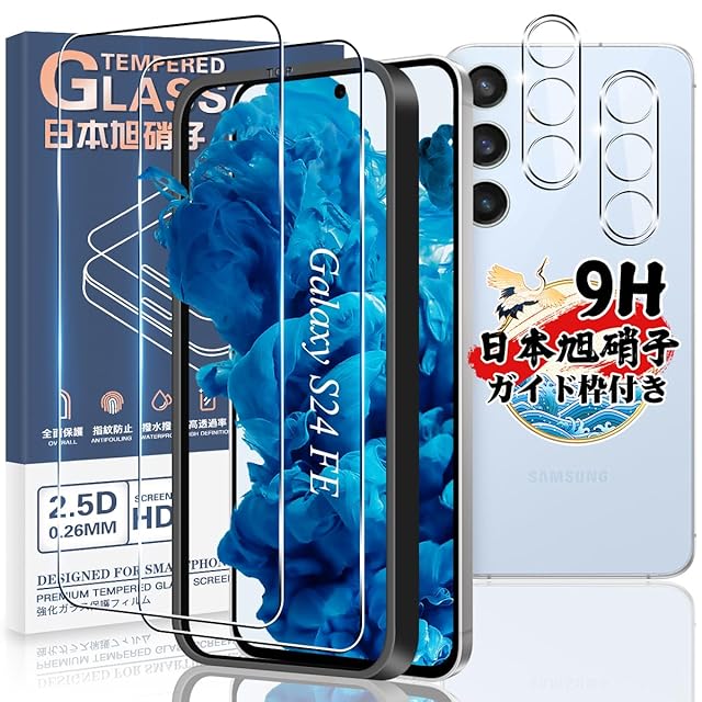 【ガイド枠付き 指紋認証対応】対応 Galaxy S24 FE ガラスフィルム 2枚 + カメラ保護フィルム2枚【4枚セット 日本旭硝子製】ギャラクシー S24 FE 用 フィルム SCG30/SM-S721Q 用 強化ガラス 液晶 保護フィルム ケース 硬度9H 耐衝撃 高感度タッチ 指紋防止 自動吸着 気泡ゼロ 貼り付け簡単