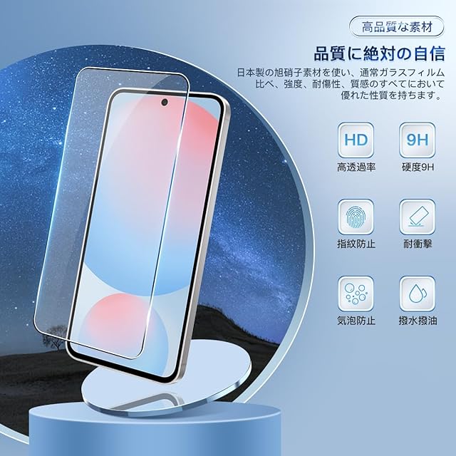 <b>対応機種:対応 Galaxy S24 FE SCG30/SM-S721Q</b> <br><b>購入前に対応機種をご確認よろしくお願い致します</b> <br><b>厚み0.26mmの強化ガラスを使用した、対応 Galaxy S24 FE ガラスフィルム。日本製素材旭硝子製を採用しております、9Hの表面硬度を誇る強化ガラス,ナイフに触れても傷つきにくく</b><br><b>【製品特徴】</b> <br>①旭硝子素材硬度9H<br>②貼り付けが可能で、気泡が発生しにくいです<br>③高透過率&高感度タッチ<br>④撥水・撥油加工で指紋や皮脂の付着を防げ<br>⑤2.5D ラウンドエッジ仕様<br><b>【耐久性 安全性】</b> <br>日本製旭硝子素材の採用、9H硬度、強化ガラス 耐衝撃、スクラッチ防止。飛散防止加工、激しい衝撃を受けてもガラスフィルムは貼り付けのままでございます<br><b>【貼り付けやすい】</b> <br>専用のガイド枠付きで、正確な位置に完璧に貼り付けることができます、誰でも簡単に貼り付けることができます<br><b>【99%高透過率】</b> <br>透過率99%超えのフィルムで、液晶画面の鮮明度を損なうことなく画面本来の美しさをそのまま表現,よい手触り感でしかもスムーズな操作感をご体験いただけます<br><b>【指紋防止】</b> <br>指紋防止、飛散防止 撥油コーティング加工されているため、耐油性に優れ、指紋がつきにくく、付着した汚れなどは簡単に拭きとれます<br><b>【2.5D加工】</b> <br>2.5Dラウンドエッジ処理でフィルムの角を丸く加工することで、装用時もスマホ角部分の違和感が無く高級感がアップ、 市販の99%の保護ケースと干渉しなく、相性が良いものです。<br><b>【スムーズな操作感】</b> <br>高感度タッチ 極薄の厚さでタッチスクリーンの反応を損なわず表面のオイル加工により快適な操作が可能。スクリーンにタッチするとすぐにフィードバックができます。遅延の心配はありません<br><b>パッケージ内容</b> <br>2×強化ガラス保護フィルム <br>2×カメラフィルム<br>4×ダストステッカー<br>1xガイド枠<br>1x取扱説明書<br><b>貼り付け方法:</b><br>1.スマホ電源をオフにし、保護フィルムとクリーニングクロスなどを取り出してください。<br>2.アルコールパッドを使って液晶画面の汚れを拭き取リます。<br>3.ホコリ取りシートを使って、液晶画面に残ったホコリや布繊維を取り除きます。<br>4.ガイド枠を本体位置に合わせて取り付ける。ホコリ取りシールを再度使用し、ホコリを除去する。<br>5.ガラスフィルムを取り出して、白い台紙を後ろから丁寧に剥がしてください。液晶画面に合うよう慎重にガラスフィルムをのせます。<br>6.保護フィルムを置いた後、指でゆっくりと液晶画面の最初から最後までスライドします。保護フィルムは自動的に端に吸着しますので、少々お待ちください。<br>7.残った気泡をクリーニングクロスで、フィルムの外側に向かって指で押し出すようにして取り除きます。<br>8.貼り付けが完了。クリーニングクロスで液晶画面をよく拭いてください。