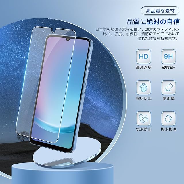 <b>対応機種:対応 Galaxy A25 5G SC-53F/SCG33</b> <br><b>購入前に対応機種をご確認よろしくお願い致します</b> <br><b>厚み0.26mmの強化ガラスを使用した、対応 ギャラクシーa25 5G ガラスフィルム。日本製素材旭硝子製を採用しております、9Hの表面硬度を誇る強化ガラス,ナイフに触れても傷つきにくく</b><br><b>【製品特徴】</b> <br>①旭硝子素材硬度9H<br>②貼り付けが可能で、気泡が発生しにくいです<br>③高透過率&高感度タッチ<br>④撥水・撥油加工で指紋や皮脂の付着を防げ<br>⑤2.5D ラウンドエッジ仕様<br><b>【耐久性 安全性】</b> <br>日本製旭硝子素材の採用、9H硬度、強化ガラス 耐衝撃、スクラッチ防止。飛散防止加工、激しい衝撃を受けてもガラスフィルムは貼り付けのままでございます<br><b>【貼り付けやすい】</b> <br>専用のガイド枠付きで、正確な位置に完璧に貼り付けることができます、誰でも簡単に貼り付けることができます<br><b>【99%高透過率】</b> <br>透過率99%超えのフィルムで、液晶画面の鮮明度を損なうことなく画面本来の美しさをそのまま表現,よい手触り感でしかもスムーズな操作感をご体験いただけます<br><b>【指紋防止】</b> <br>指紋防止、飛散防止 撥油コーティング加工されているため、耐油性に優れ、指紋がつきにくく、付着した汚れなどは簡単に拭きとれます<br><b>【2.5D加工】</b> <br>2.5Dラウンドエッジ処理でフィルムの角を丸く加工することで、装用時もスマホ角部分の違和感が無く高級感がアップ、 市販の99%の保護ケースと干渉しなく、相性が良いものです。<br><b>【スムーズな操作感】</b> <br>高感度タッチ 極薄の厚さでタッチスクリーンの反応を損なわず表面のオイル加工により快適な操作が可能。スクリーンにタッチするとすぐにフィードバックができます。遅延の心配はありません<br><b>パッケージ内容</b> <br>2×強化ガラス保護フィルム <br>2×カメラフィルム<br>4×ダストステッカー<br>1xガイド枠<br>1x取扱説明書<br><b>貼り付け方法:</b><br>1.スマホ電源をオフにし、保護フィルムとクリーニングクロスなどを取り出してください。<br>2.アルコールパッドを使って液晶画面の汚れを拭き取リます。<br>3.ホコリ取りシートを使って、液晶画面に残ったホコリや布繊維を取り除きます。<br>4.ガイド枠を本体位置に合わせて取り付ける。ホコリ取りシールを再度使用し、ホコリを除去する。<br>5.ガラスフィルムを取り出して、白い台紙を後ろから丁寧に剥がしてください。液晶画面に合うよう慎重にガラスフィルムをのせます。<br>6.保護フィルムを置いた後、指でゆっくりと液晶画面の最初から最後までスライドします。保護フィルムは自動的に端に吸着しますので、少々お待ちください。<br>7.残った気泡をクリーニングクロスで、フィルムの外側に向かって指で押し出すようにして取り除きます。<br>8.貼り付けが完了。クリーニングクロスで液晶画面をよく拭いてください。