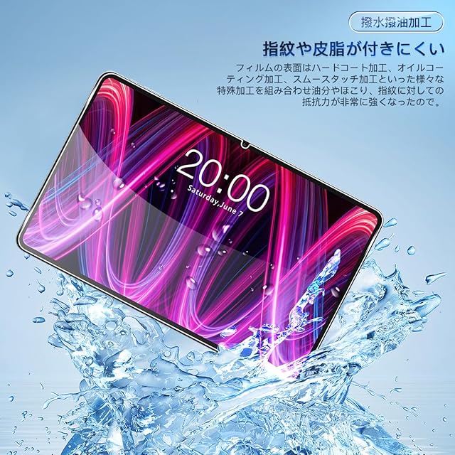 ★【防水·耐油汚れ·指紋防止】フィルムの表面はハードコート加工、オイルコーティング加工、スムースタッチ加工といった様々な特殊加工を組み合わせ油分やほこり、指紋に対しての抵抗力が非常に強くなったので,指紋や汚れの跡が画面に付きにくく、タブレットをずっときれいなボディーを保持させ、頻繁にスマホを拭く悩みがなくなります。