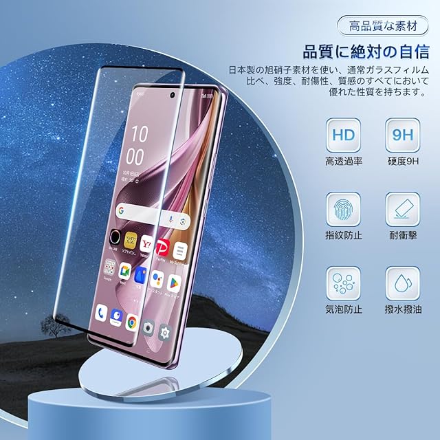 対応機種:対応 OPPO Reno10 Pro 5G 購入前に対応機種をご確認よろしくお願い致します 厚み0.26mmの強化ガラスを使用した、対応 OPPO Reno10 Pro 5G ガラスフィルム日本製素材旭硝子製を採用しております、9Hの表面硬度を誇る強化ガラス,ナイフに触れても傷つきにくく【製品特徴】 旭硝子素材硬度9H②貼り付けが可能で、気泡が発生しにくいです③高透過率&高感度タッチ④撥水・撥油加工で指紋や皮脂の付着を防げ⑤2.5D ラウンドエッジ仕様【耐久性 安全性】 日本製旭硝子素材の採用、9H硬度、強化ガラス 耐衝撃、スクラッチ防止飛散防止加工、激しい衝撃を受けてもガラスフィルムは貼り付けのままでございます【貼り付けやすい】 気泡防止 アルコールパッド・クリーニングクロス・静電気ホコリ取りシートを使用することにより 気泡が入りにくく、誰でも簡単に貼り付けることができます【99%高透過率】 透過率99%超えのフィルムで、液晶画面の鮮明度を損なうことなく画面本来の美しさをそのまま表現,よい手触り感でしかもスムーズな操作感をご体験いただけます【指紋防止】 指紋防止、飛散防止 撥油コーティング加工されているため、耐油性に優れ、指紋がつきにくく、付着した汚れなどは簡単に拭きとれます【2.5D加工】 2.5Dラウンドエッジ処理でフィルムの角を丸く加工することで、装用時もスマホ角部分の違和感が無く高級感がアップ、 市販の99%の保護ケースと干渉しなく、相性が良いものです【スムーズな操作感】 高感度タッチ 極薄の厚さでタッチスクリーンの反応を損なわず表面のオイル加工により快適な操作が可能スクリーンにタッチするとすぐにフィードバックができます遅延の心配はありませんパッケージ内容 2×強化ガラス保護フィルム 2×カメラフィルム4×アルコールパッド4×ダストステッカー1x取扱説明書貼り付け方法:ステップ1:まず、付属の緑色の「1」ウェットシートでスクリーンに付いた汚れを拭きとりますステップ2:次に、ピンク色の「2」ドライシートで水滴や指紋などを拭きとりますステップ3:付属の青色シールを使って、ホコリやごみをきれいに拭きとりますステップ4:ガラスフィルムをスマートフォンに貼ります揭下透明的胶卷贴纸液晶の上に軽く置きながら、位置を調整してください埃が付かないように注意してくださいステップ5:中央から外の方に、押しながら貼り付けます