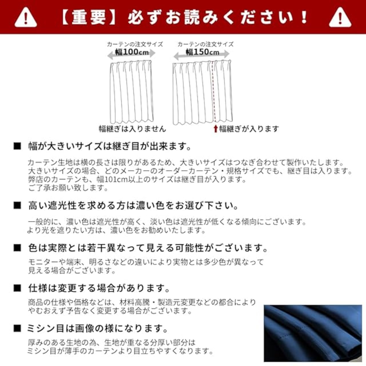 このカーテンは遮光度99.99%以上の「一級遮光」仕様で、外光をほぼ完全に遮断し、昼間でも室内を真っ暗にできます。遮光効果は色によって異なり、濃色ほど遮光性が高まるため、光を徹底的に遮りたい方にはダークカラーがおすすめです。素材は100%ポリエステルの高密度厚地で、遮熱・保温・防音効果に優れ、表裏同色のデザインで使い勝手も良好。三重織り技術により黒系糸を織り込んでおり、紫外線や西日をしっかりカットします。さらに、生地の特性により夏は涼しく、冬は暖かく保ち、冷暖房効率を向上させ光熱費削減にも貢献。洗濯機対応で形崩れしにくく、手入れも簡単です。機能性と実用性を兼ね備えた、年間を通じて活躍する高品質遮光カーテンです。