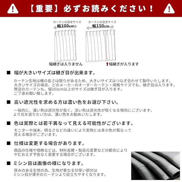 このカーテンは遮光度99.99%以上の「一級遮光」仕様で、外光をほぼ完全に遮断し、昼間でも室内を真っ暗にできます。遮光効果は色によって異なり、濃色ほど遮光性が高まるため、光を徹底的に遮りたい方にはダークカラーがおすすめです。素材は100%ポリエステルの高密度厚地で、遮熱・保温・防音効果に優れ、表裏同色のデザインで使い勝手も良好。三重織り技術により黒系糸を織り込んでおり、紫外線や西日をしっかりカットします。さらに、生地の特性により夏は涼しく、冬は暖かく保ち、冷暖房効率を向上させ光熱費削減にも貢献。洗濯機対応で形崩れしにくく、手入れも簡単です。機能性と実用性を兼ね備えた、年間を通じて活躍する高品質遮光カーテンです。