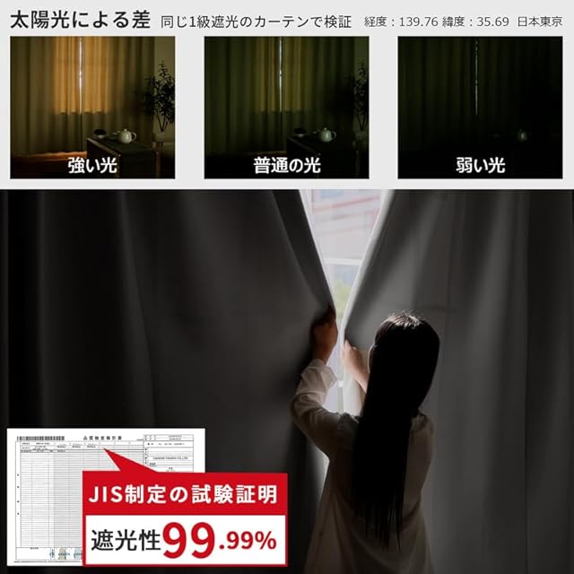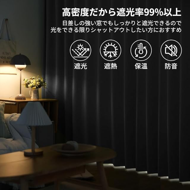 【プライバシーを守る】室内の光を外に漏れにくくする効果があるだけではなく、夜に部屋の明かりを付けている時でも外から人影が見えづらく、プライバシーを守ることができます。女性の一人暮らしでもこのカーテンなら安心できる。
