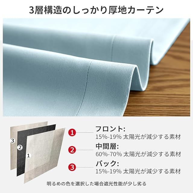 このカーテンは遮光度99.99%以上の「一級遮光」仕様で、外光をほぼ完全に遮断し、昼間でも室内を真っ暗にできます。遮光効果は色によって異なり、濃色ほど遮光性が高まるため、光を徹底的に遮りたい方にはダークカラーがおすすめです。素材は100%ポリエステルの高密度厚地で、遮熱・保温・防音効果に優れ、表裏同色のデザインで使い勝手も良好。三重織り技術により黒系糸を織り込んでおり、紫外線や西日をしっかりカットします。さらに、生地の特性により夏は涼しく、冬は暖かく保ち、冷暖房効率を向上させ光熱費削減にも貢献。洗濯機対応で形崩れしにくく、手入れも簡単です。機能性と実用性を兼ね備えた、年間を通じて活躍する高品質遮光カーテンです。