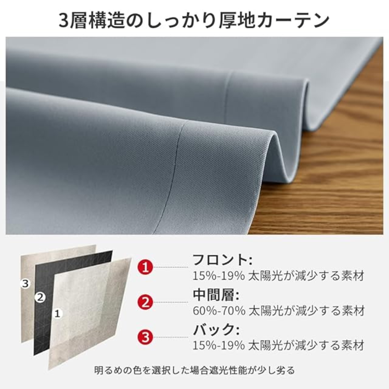 このカーテンは遮光度99.99%以上の「一級遮光」仕様で、外光をほぼ完全に遮断し、昼間でも室内を真っ暗にできます。遮光効果は色によって異なり、濃色ほど遮光性が高まるため、光を徹底的に遮りたい方にはダークカラーがおすすめです。素材は100%ポリエステルの高密度厚地で、遮熱・保温・防音効果に優れ、表裏同色のデザインで使い勝手も良好。三重織り技術により黒系糸を織り込んでおり、紫外線や西日をしっかりカットします。さらに、生地の特性により夏は涼しく、冬は暖かく保ち、冷暖房効率を向上させ光熱費削減にも貢献。洗濯機対応で形崩れしにくく、手入れも簡単です。機能性と実用性を兼ね備えた、年間を通じて活躍する高品質遮光カーテンです。