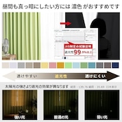 このカーテンは遮光度99.99%以上の「一級遮光」仕様で、外光をほぼ完全に遮断し、昼間でも室内を真っ暗にできます。遮光効果は色によって異なり、濃色ほど遮光性が高まるため、光を徹底的に遮りたい方にはダークカラーがおすすめです。素材は100%ポリエステルの高密度厚地で、遮熱・保温・防音効果に優れ、表裏同色のデザインで使い勝手も良好。三重織り技術により黒系糸を織り込んでおり、紫外線や西日をしっかりカットします。さらに、生地の特性により夏は涼しく、冬は暖かく保ち、冷暖房効率を向上させ光熱費削減にも貢献。洗濯機対応で形崩れしにくく、手入れも簡単です。機能性と実用性を兼ね備えた、年間を通じて活躍する高品質遮光カーテンです。