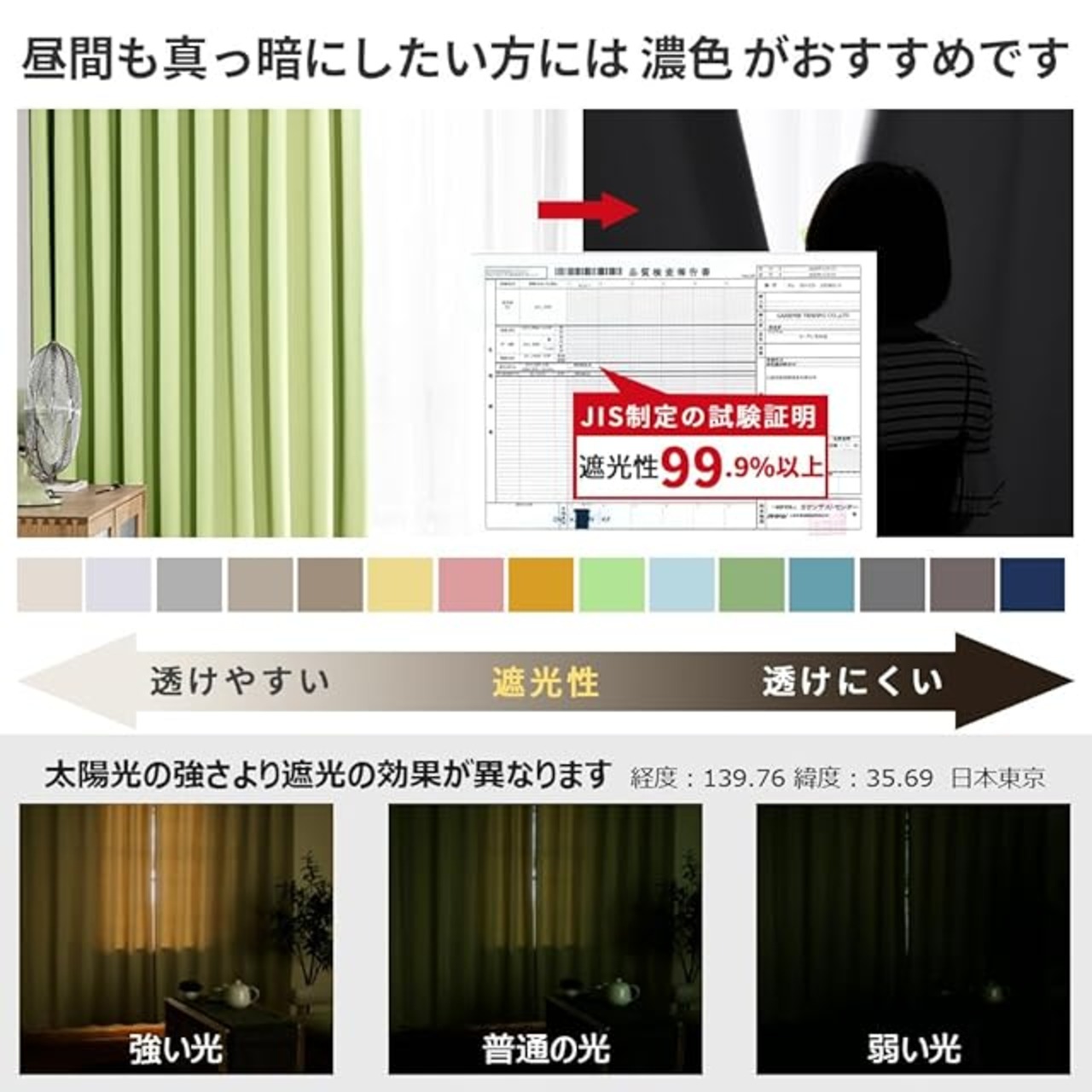 このカーテンは遮光度99.99%以上の「一級遮光」仕様で、外光をほぼ完全に遮断し、昼間でも室内を真っ暗にできます。遮光効果は色によって異なり、濃色ほど遮光性が高まるため、光を徹底的に遮りたい方にはダークカラーがおすすめです。素材は100%ポリエステルの高密度厚地で、遮熱・保温・防音効果に優れ、表裏同色のデザインで使い勝手も良好。三重織り技術により黒系糸を織り込んでおり、紫外線や西日をしっかりカットします。さらに、生地の特性により夏は涼しく、冬は暖かく保ち、冷暖房効率を向上させ光熱費削減にも貢献。洗濯機対応で形崩れしにくく、手入れも簡単です。機能性と実用性を兼ね備えた、年間を通じて活躍する高品質遮光カーテンです。