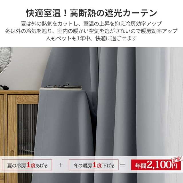 【遮熱保温·形状記憶】届いてすぐ使えるドレープカーテン2枚、同色タッセル付きます。夏は外の熱気をカットし、室温の上昇を抑え冷房効率アップします。冬は外の冷気を遮り、室内の暖かい空気を逃がさないので暖房効率もアップします。ペットにも1年中快適に過ごせます。洗濯機でまるごと洗えます。お手入れしやすいのでいつも清潔に使用できます。カーテンの重みで洗濯ジワも伸ばすことができので、形態安定としてはとても効果が期待できます。