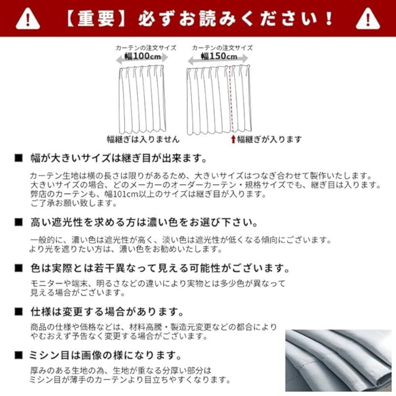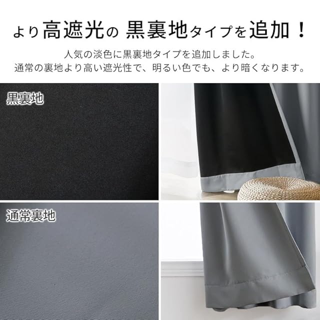 【高い機能性高密度な生地】黒裏地タイプを追加しました。通常の裏地より高い遮光性で、明るい色でも、より暗くなります。黒裏地付きの高密度なカーテンなので、遮光性はもちろん、断熱・保温性を上げて電気代の節約します。