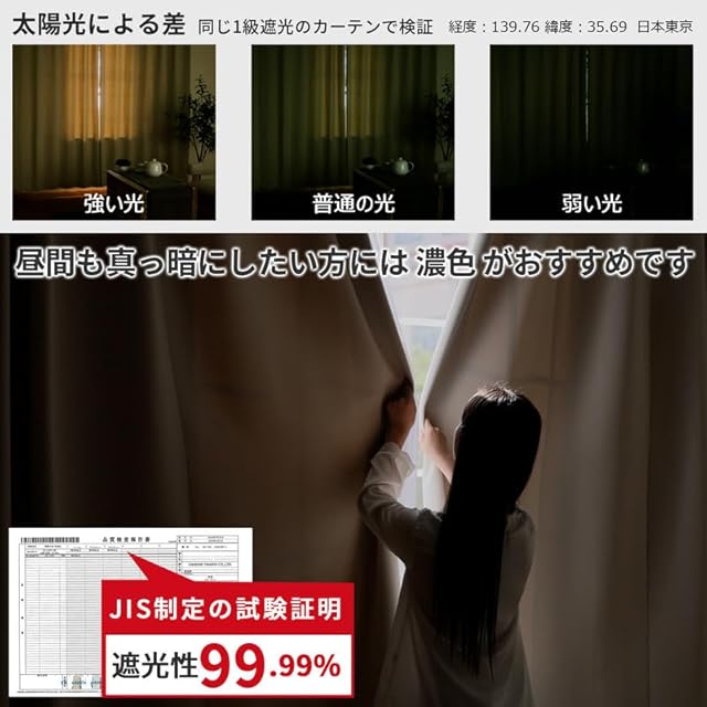 【プライバシーを守る】室内の光を外に漏れにくくする効果があるだけではなく、夜に部屋の明かりを付けている時でも外から人影が見えづらく、プライバシーを守ることができます。女性の一人暮らしでもこのカーテンなら安心できる。