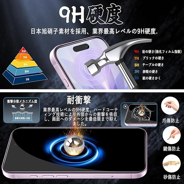 【日本製旭硝子製素材・硬度9H】表面硬度9Hと非常に高い硬度の持つ素材を採用し、外部の衝撃を吸収し、画面への損傷を最小限に抑えることができます。日々の生活の中で発生しうるスリ傷から液晶画面を保護します、耐久性がありながら損傷しにくいです。