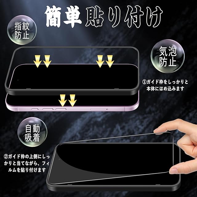 【貼付け簡単・専用ガイド枠付き】専用の貼り付けガイド枠が同梱されています。ガイド枠を利用することで、初心者でも簡単に貼り付けます。すべての失敗の発生を防ぐことができて、ご心配を完全に解消します!グレードアップしたイオン自働吸着技術を採用して、初心者でもたった3ステップ、10秒で簡単に綺麗で貼り付けることができます。