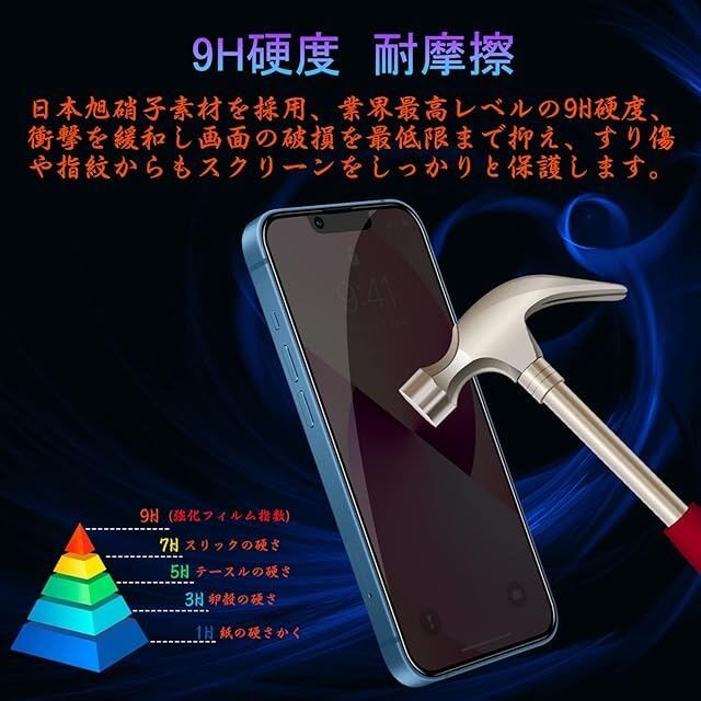 【日本製旭硝子製素材・硬度9H】表面硬度9Hと非常に高い硬度の持つ素材を採用し、外部の衝撃を吸収し、画面への損傷を最小限に抑えることができます。日々の生活の中で発生しうるスリ傷から液晶画面を保護します、耐久性がありながら損傷しにくいです。