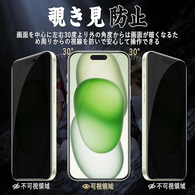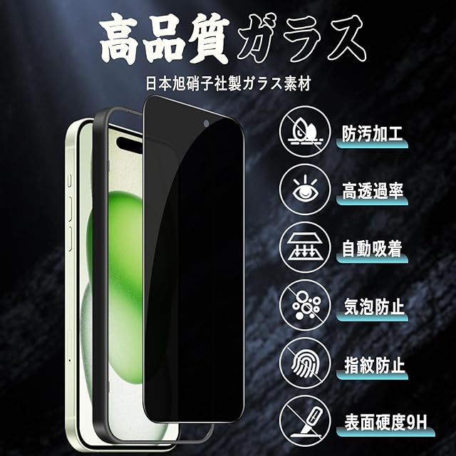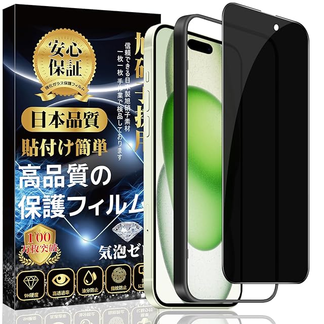 商品名:対応 iPhone 15 ガラスフィルム 【覗き見防止】 保護フィルム (専用ガイド枠付き 貼り付け簡単 指紋防止 気泡防止 飛散防止 キズ防止) iPhone 15 強化ガラスフィルム (1枚)