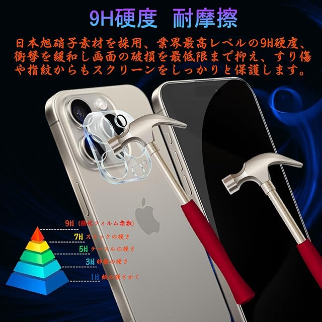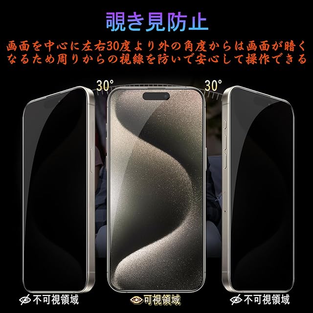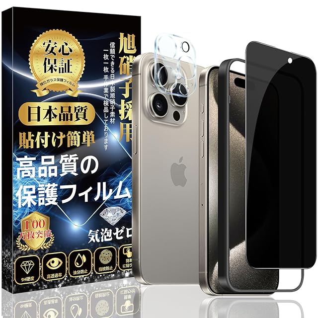 商品名:対応 iPhone 15pro ガラスフィルム (1枚) + iPhone 15pro カメラフィルム (1枚) 【覗き見防止】 専用ガイド枠付き 保護フィルム [日本旭硝子製 硬度9H 高透過率 飛散防止] アイフォン 15pro レンズフィルム + アイフォン 15pro フィルム