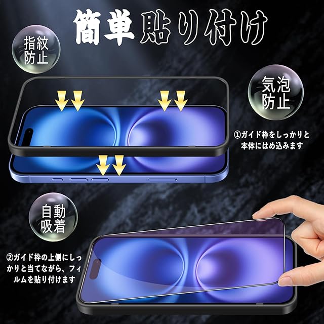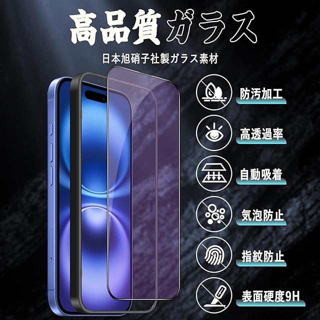 商品名:対応 iPhone 16 ガラスフィルム iPhone 16 全面保護 フィルム 【ブルーライトカット】 [ガイド枠付き/貼り付け簡単/指紋防止/気泡防止/飛散防止] アイフォン 16 強化 ガラスフィルム (1枚)