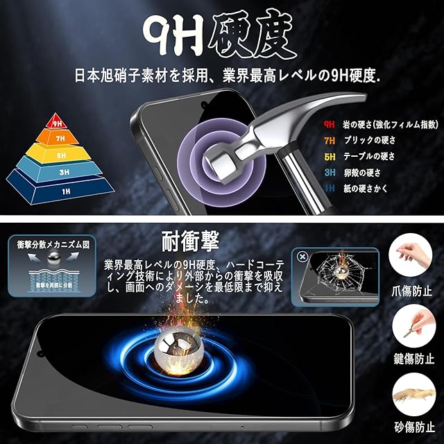 【日本製旭硝子製素材・硬度9H】表面硬度9Hと非常に高い硬度の持つ素材を採用し、外部の衝撃を吸収し、画面への損傷を最小限に抑えることができます。日々の生活の中で発生しうるスリ傷から液晶画面を保護します、耐久性がありながら損傷しにくいです。