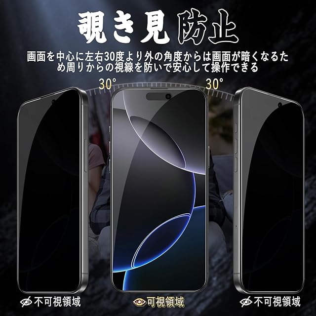【覗き見防止】覗き見防止技術により、左右の視野からの視線を防ぎ、画面のプライバシーを守ります。最新のブラインドデザインを採用し、約30°傾斜すると画面が見えなくなり、正面から見ると画面の解像度に影響を与えません。周囲の視線を気にせず、安心してLINEや動画を楽しむことができます。