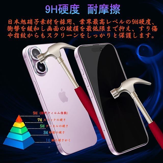 【日本製旭硝子製素材・硬度9H】表面硬度9Hと非常に高い硬度の持つ素材を採用し、外部の衝撃を吸収し、画面への損傷を最小限に抑えることができます。日々の生活の中で発生しうるスリ傷から液晶画面を保護します、耐久性がありながら損傷しにくいです。