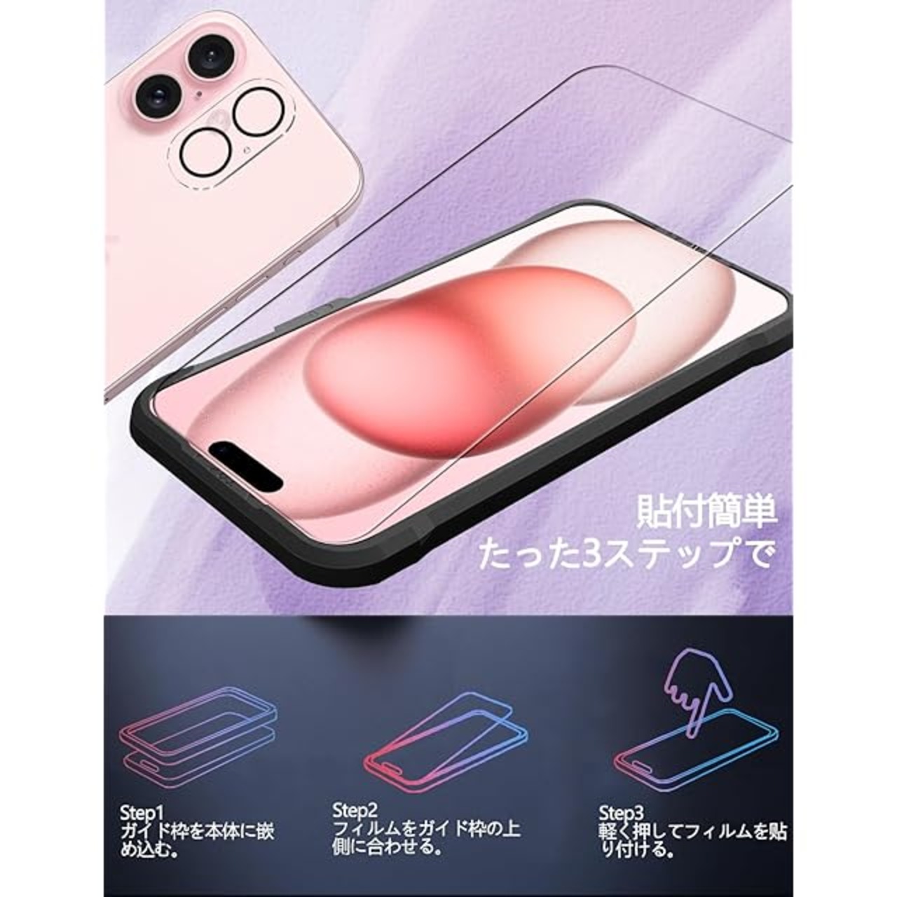 【ガイド枠】いphone16 保護フィルム ガイド枠が付属しているため、貼り付け時に保護フィルムの位置決めが簡単で、ズレることもありません。